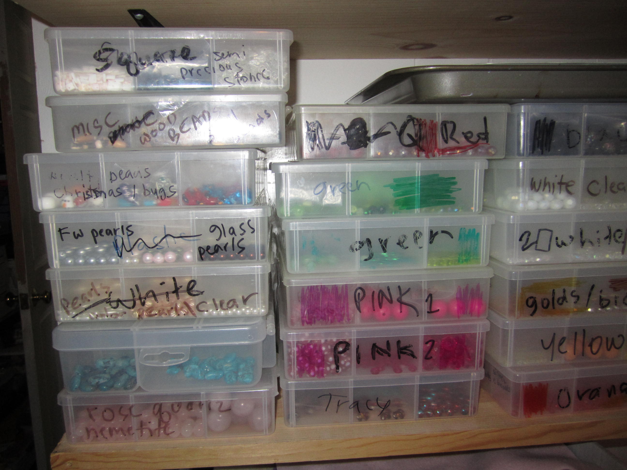 I pretty much had to go through every single thing, it was overwelming. I ended up with lots of new categories of findings, so more boxes and extra boxes for colors that overflowed thier boxes. Every one of those boxes has between 17 and 18 compartments, some have a large double and some are 18 small. Most colors still have beads combined with other beads, to give each kind of bead its own cubby in a container, that woudl take probably at least another ten to twenty boxes, so I combine. Since I take apart a lot of old jewelry, I have lots of small amounts of beads, sometimes as few as one of a bead, so combining those in the bins seems to make the most sense.