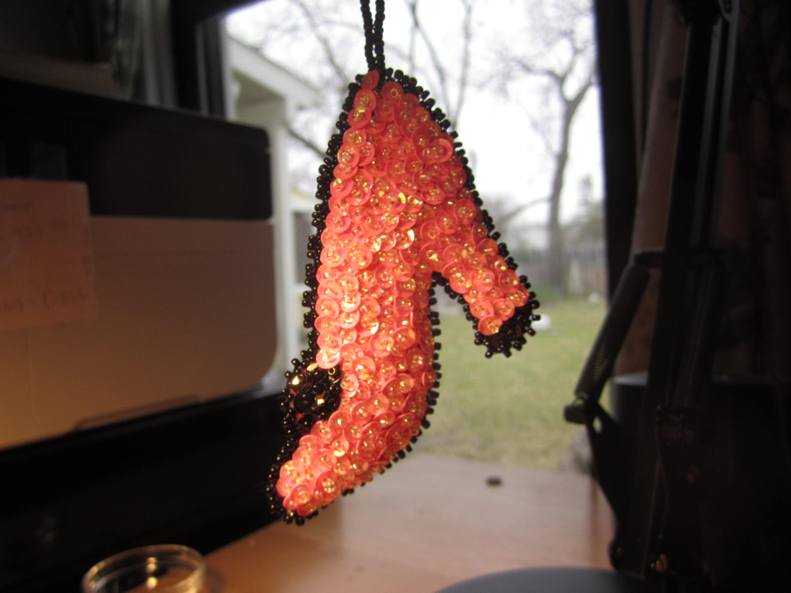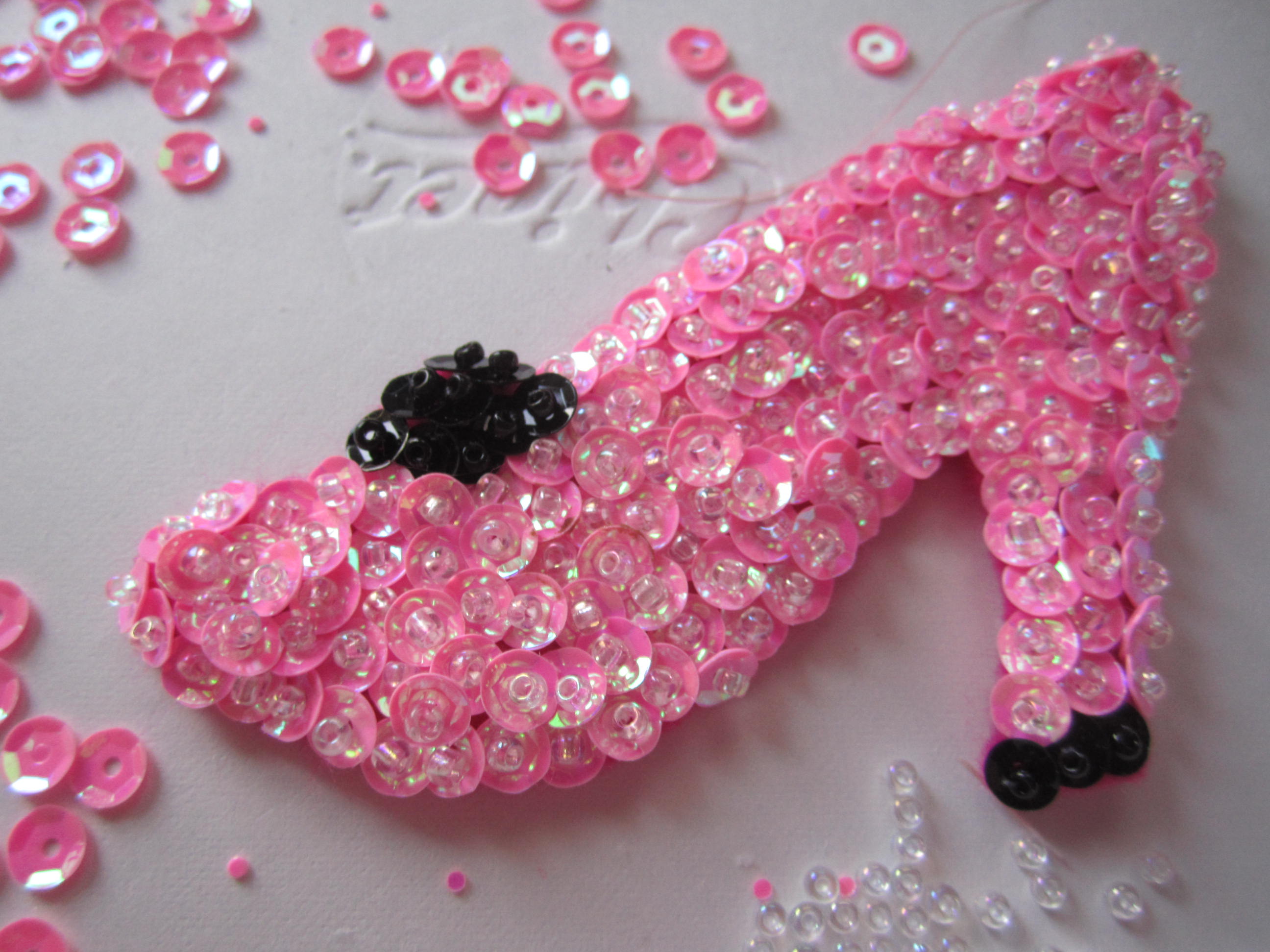 I just finished a new beaded project !! Something I have never done before and I am really happy with it !! A beaded and sequined shoe to hang on the car mirror or a lamp or a knob on a dressor or on a curtain rod !!