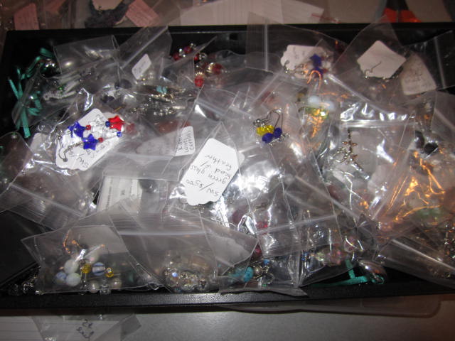 I have been going through all my inventory and getting things ready to list. I have a pile right now of 126 pairs of earrings to list and then another twenty or so I want to either change something or add something to. THat is not taking into account the 50 wine glass charms I plan to make. My studio is a mess, lol !!