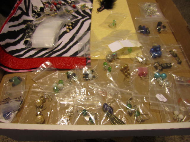 So, in the lid of the box is around 28 pairs of earrings I picked out to photograph and list. Then on the zebra felt is the stuff I have to change or add to. And then this box, from my jewelry bag has another 100 pairs in it to list plus a bunch of old junky pairs I will not be listing.
