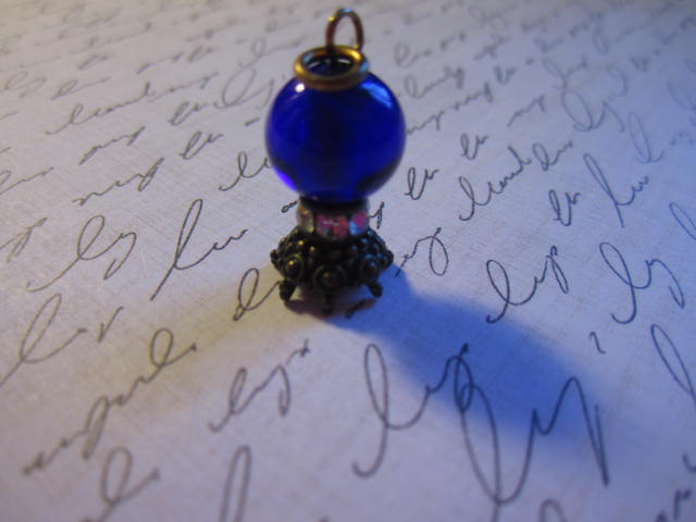 You never saw a cobalt blue crystal ball ? Just had to make one, the beads were too pretty !! I used a vintage spacer with clear pretty rhinestones between the bead the bead cap I used upside down to make a stand for the crystal ball !! Used a vintage jump ring too. From the 1970’s !!!
