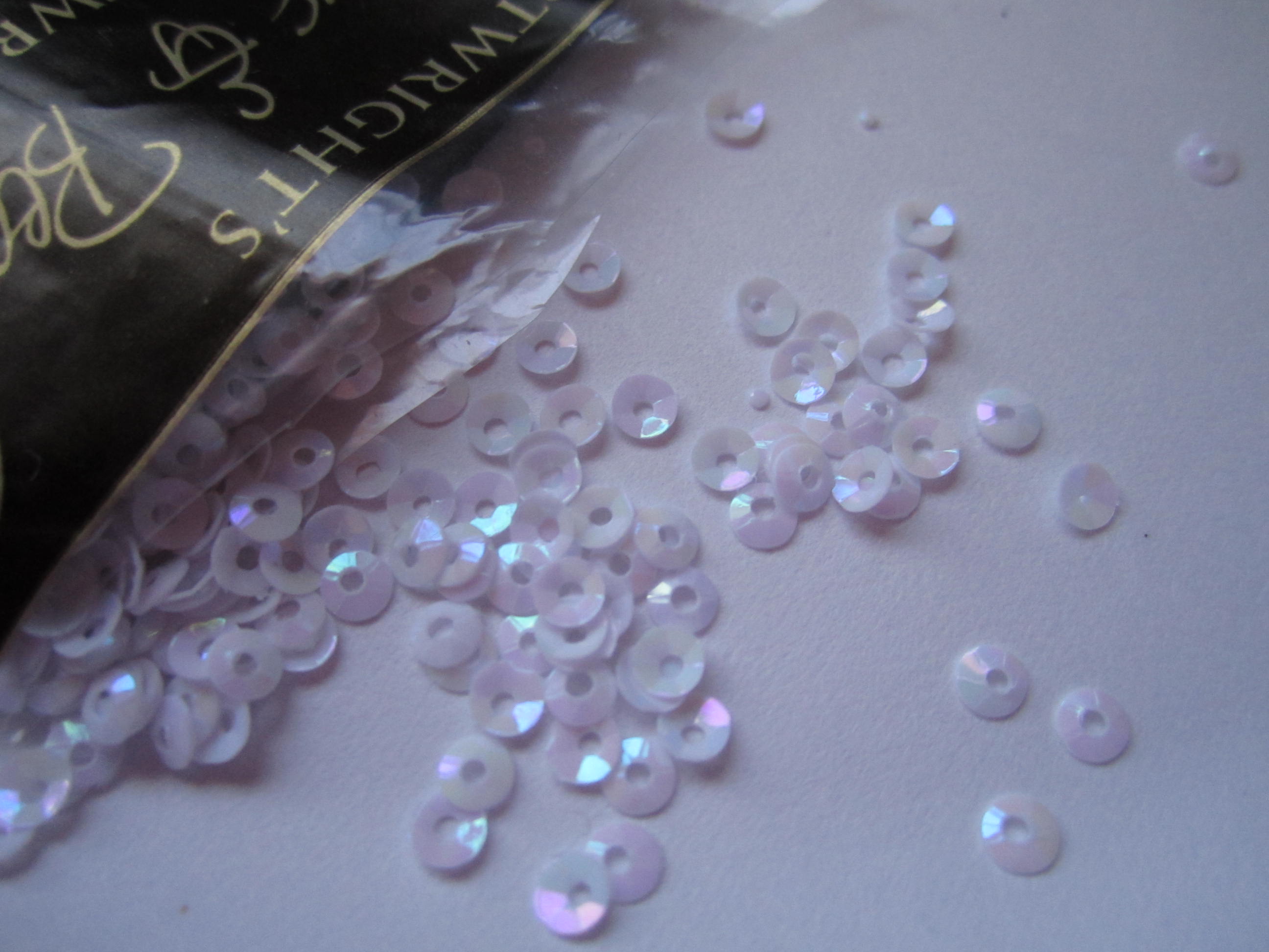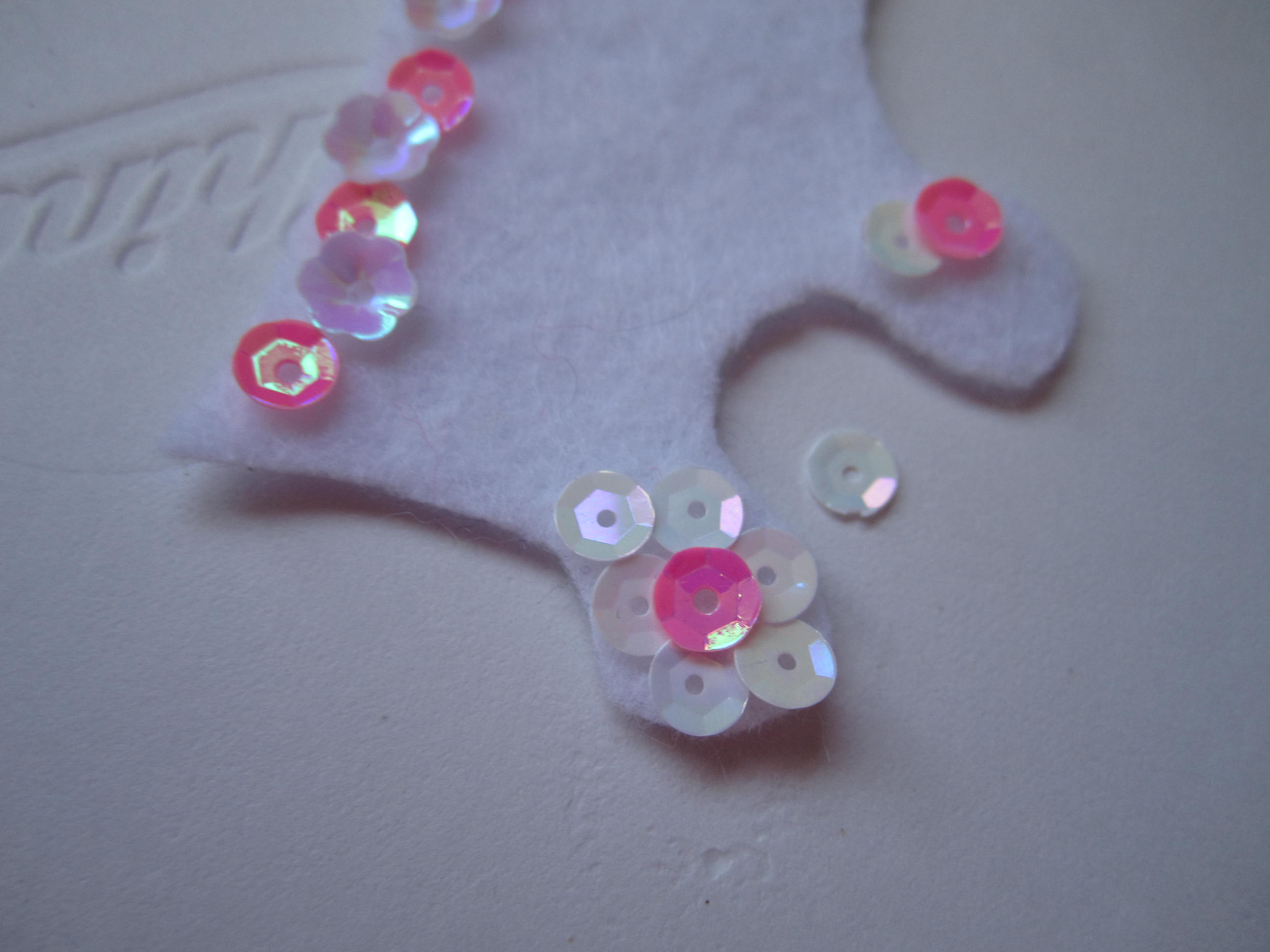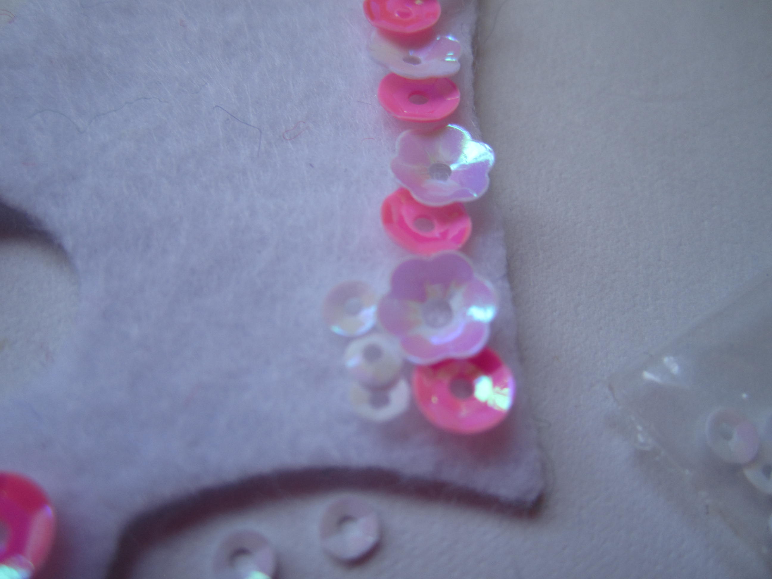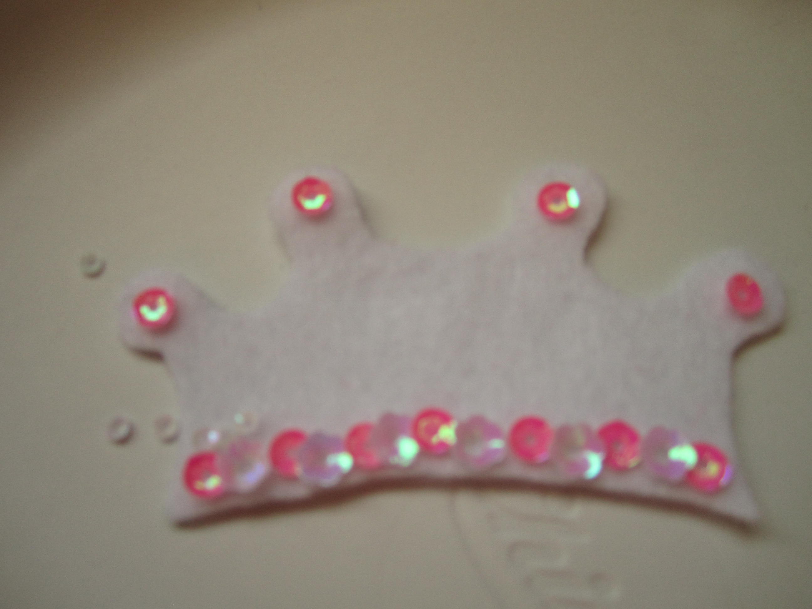 here is her soon to be crown Cut out, and the pattern of sequins laid out on a spare cut out. Hers is cut out in pink, forgot to photograph it, but I will. A pink in the center of each rounded point, with white around it, and then the bottom has alternating white flowers and pink sequins, and then above that, a row of tiny 3 mm sequins and then I will fill the rest in with pink and white sequins, the pattern is still not worked out, will get these areas done first, then maybe do a row of pink above the tiny white and then some pink flowers and white, but not sure. It has to be very girly and pink enough for a six year old girl who adores anything pink !! The loop will be pink with some pink glass or crystals on it with a silver lobster claw !!