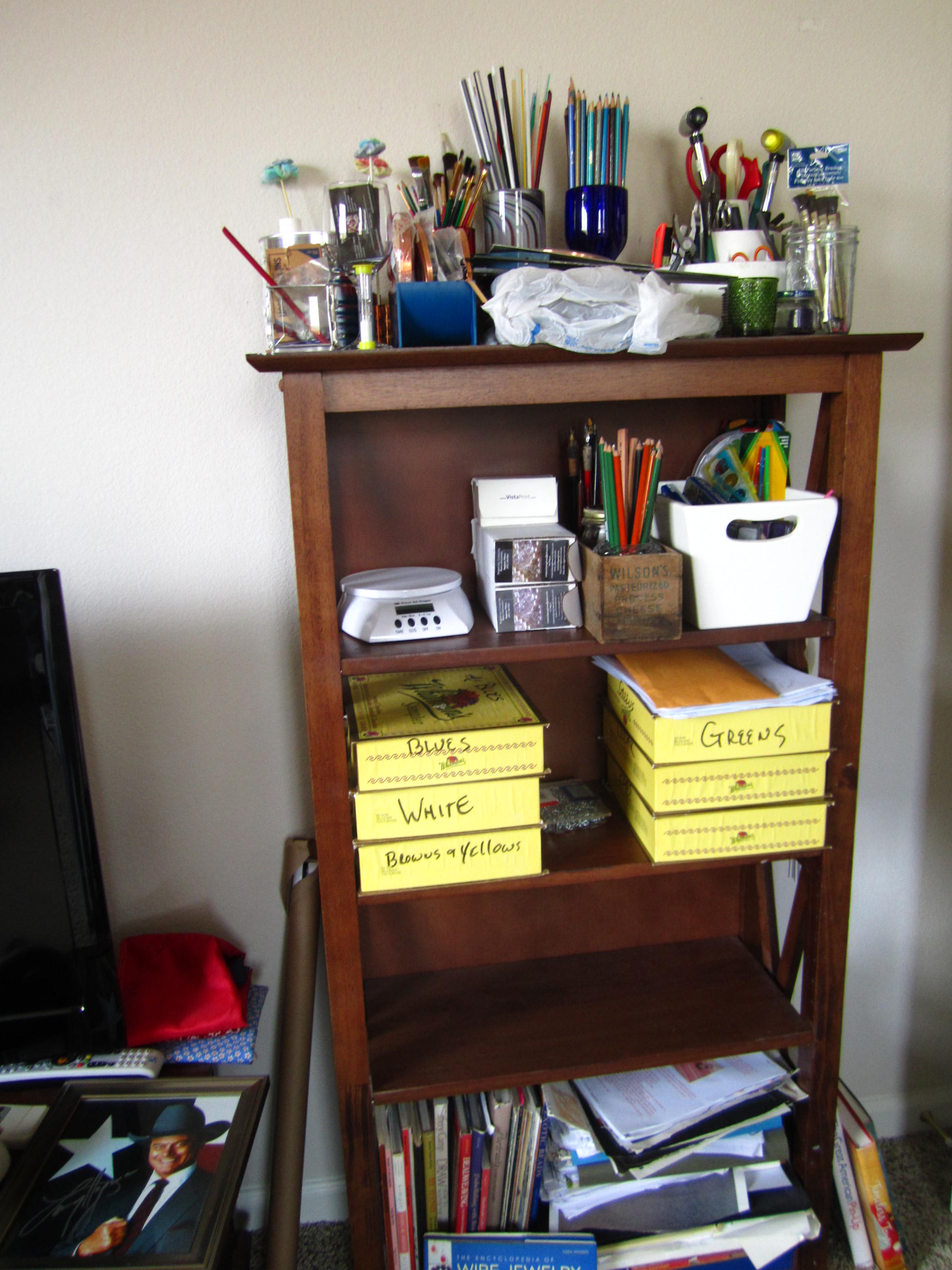 I also have all my art supplies here, pencils, pastels, brushes, and the stain glass tools, lots of stuff !! Beading and art books on the bottom shelf !!