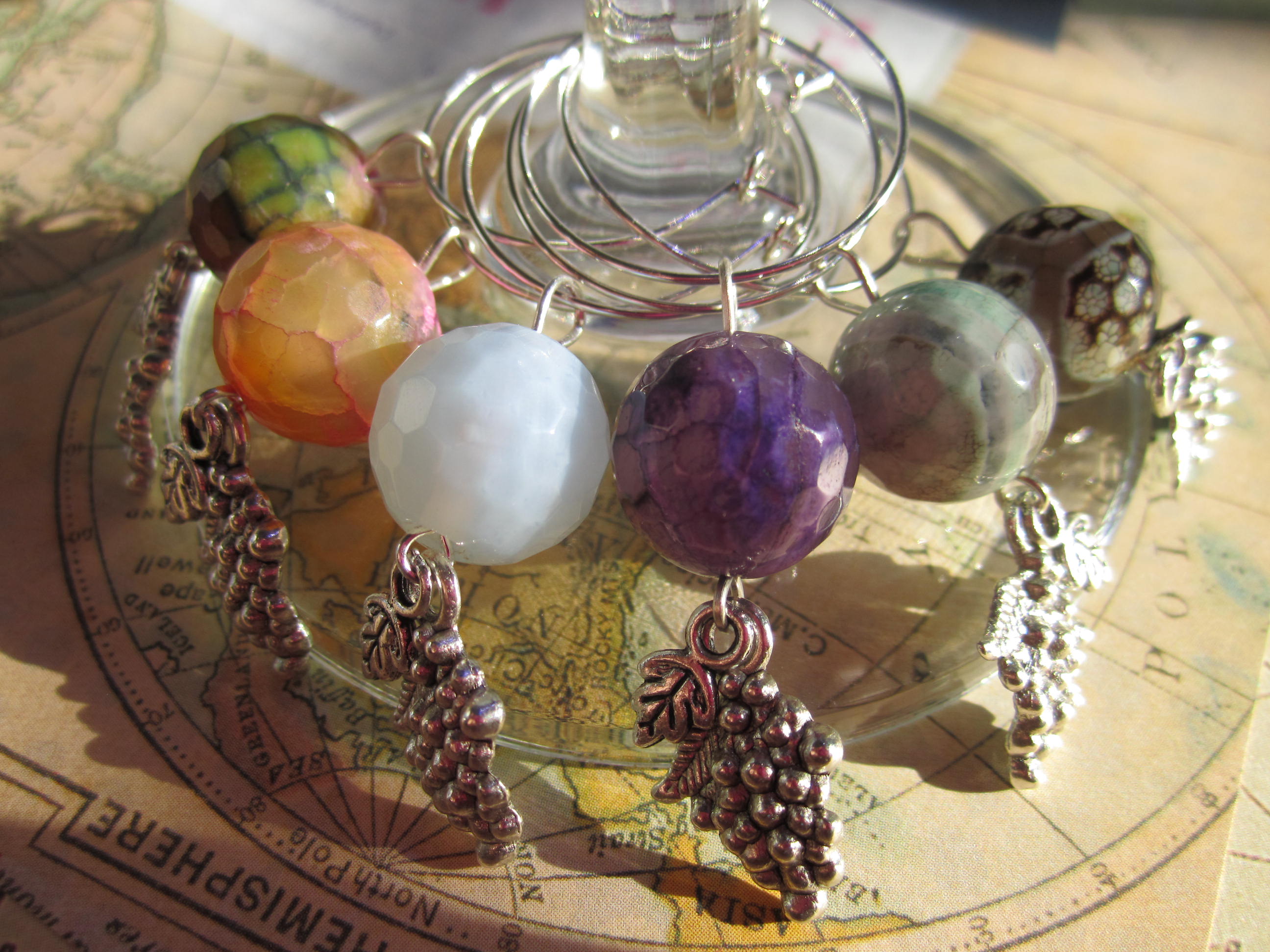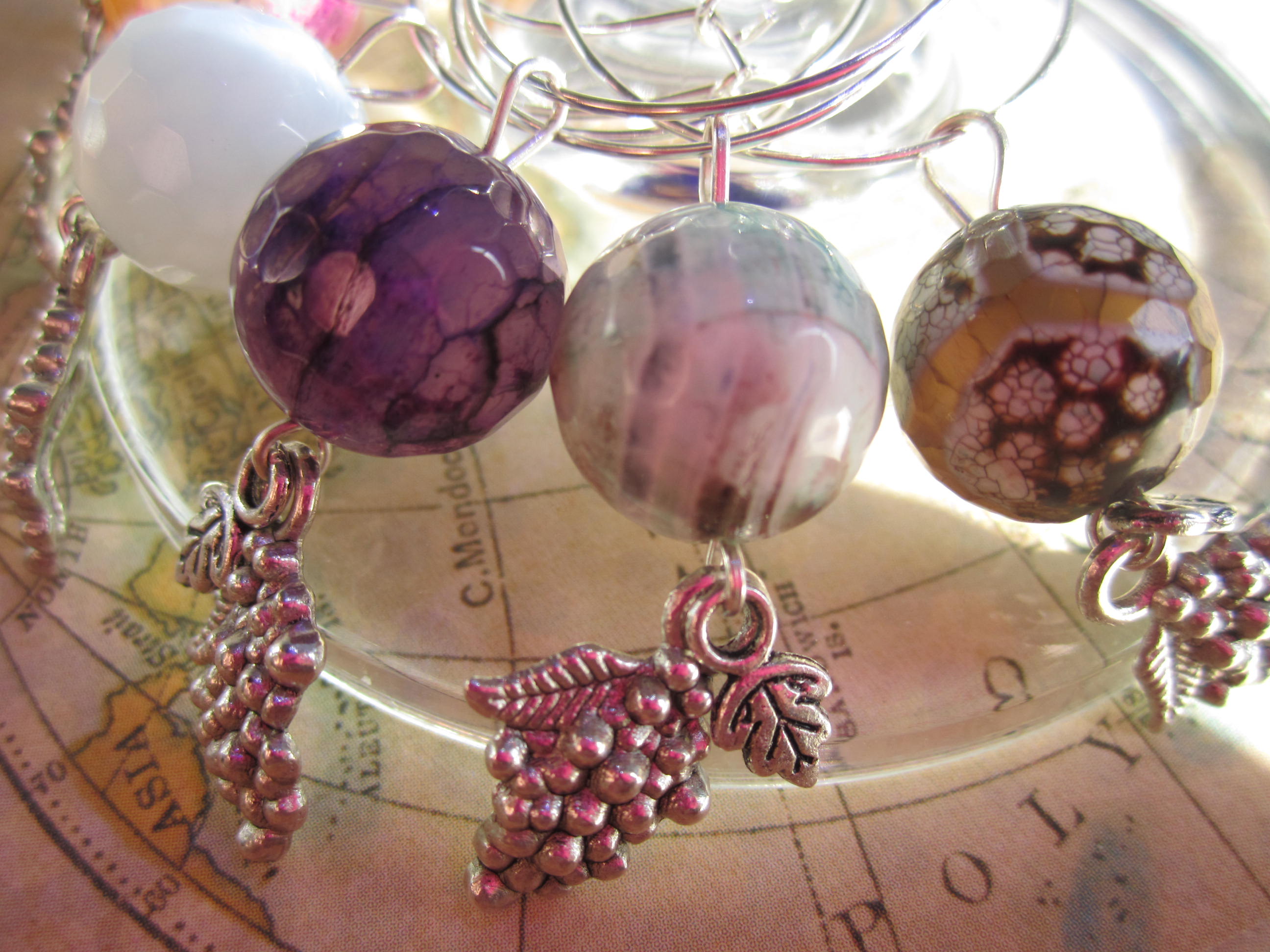 It was suggested to me by our Debt Coach over at Debt Squad, while we were talking about my jewelry and wine charms, that grapes might be a nice thing to try on my charms, so I was able to find some very nice grapes here on Etsy and here they are. I used some of my wonderful stone beads, and the wine charms with a small leaf on top. So pretty, my favorate so far !!