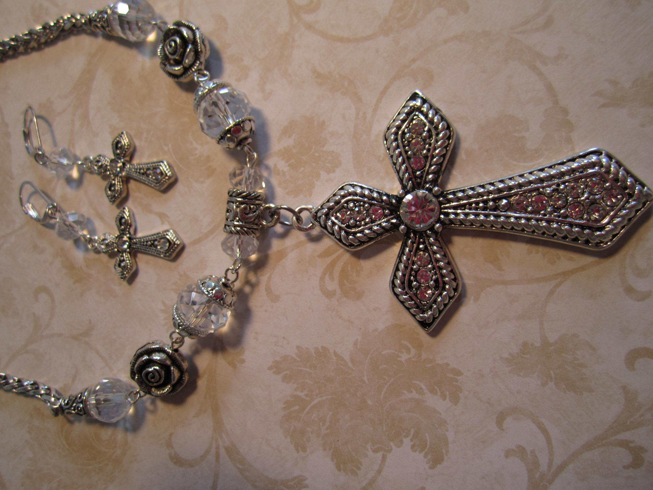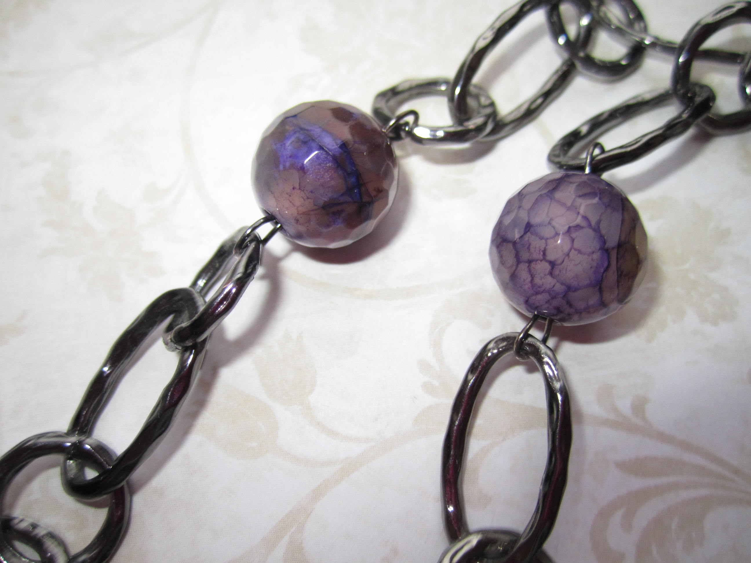 This next one is really out of my box. Gunmetal and not symetrical !! I took two of the crosses off, put it back together adding in rich purple veined stone faceted beads that are so pretty !! I made a pendant using another puple veined bead, a pretty smaller faceted stone bead and a drop shaped AB glass bead and one of the crosses I removed . I made earrings using the same elements. It is really long too !! I had to put thumb tacks on the bottom of my bulleton board and take pictures that way with it hanging down the wall, it is pretty long !!