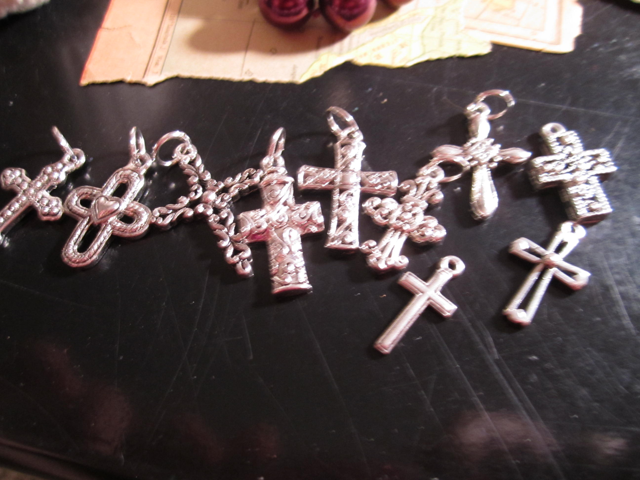 forgot to take pictures of these bracelets before I took them apart, lots of great metal findings, the round metal beads are heavy duty and nice, then the crosses from both sets will follow, got some really pretty crosses on the two bracelets !!