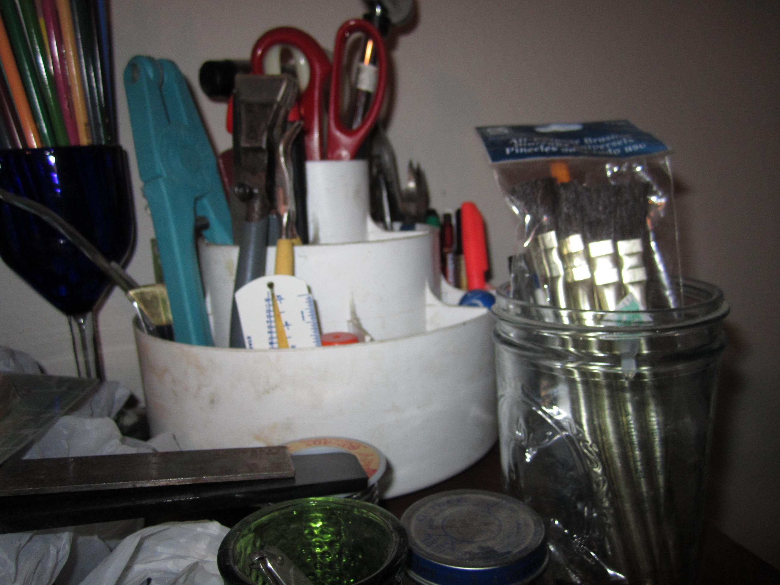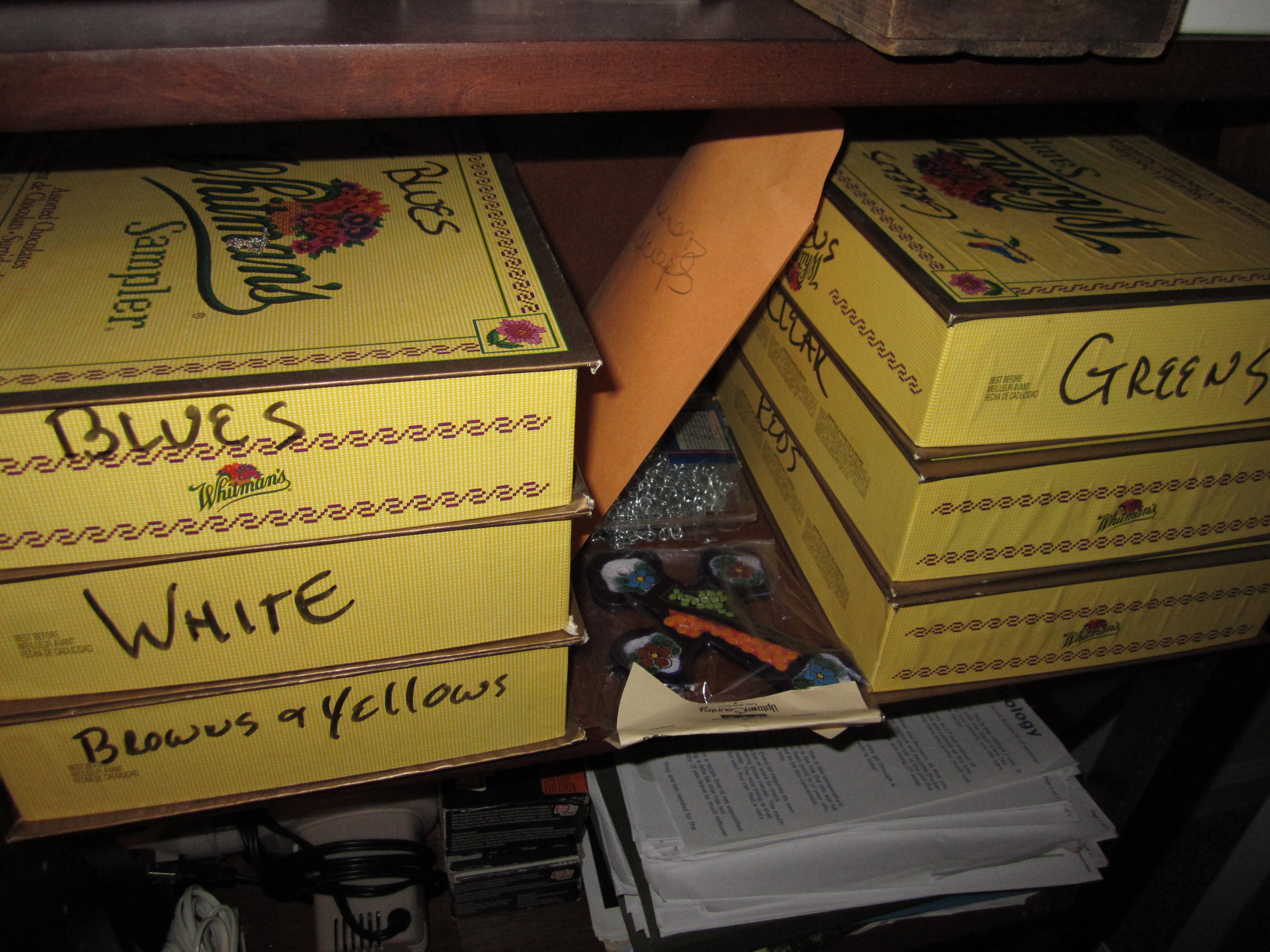 Learn Stain glass and copper foil to use in my jewelry, yep, my hubby does stain glass so I have all the stuff to do both of those !! All his big glass is put away until we move back int our house, we are currently letting our daughter and her family rent the house while we checked out other areas, but we are going to move home when they are done, so for now, we have six Whitman candy boxes, two pounders, full of small pieces and some fairly big small pieces from past projects, so perfect for what I want to do !! All the tools are here in my studio, we just have not made time for it !! We even have all the stuff to make glass beads, the glass rods look really pretty in a blown glass vase on my shelf ….