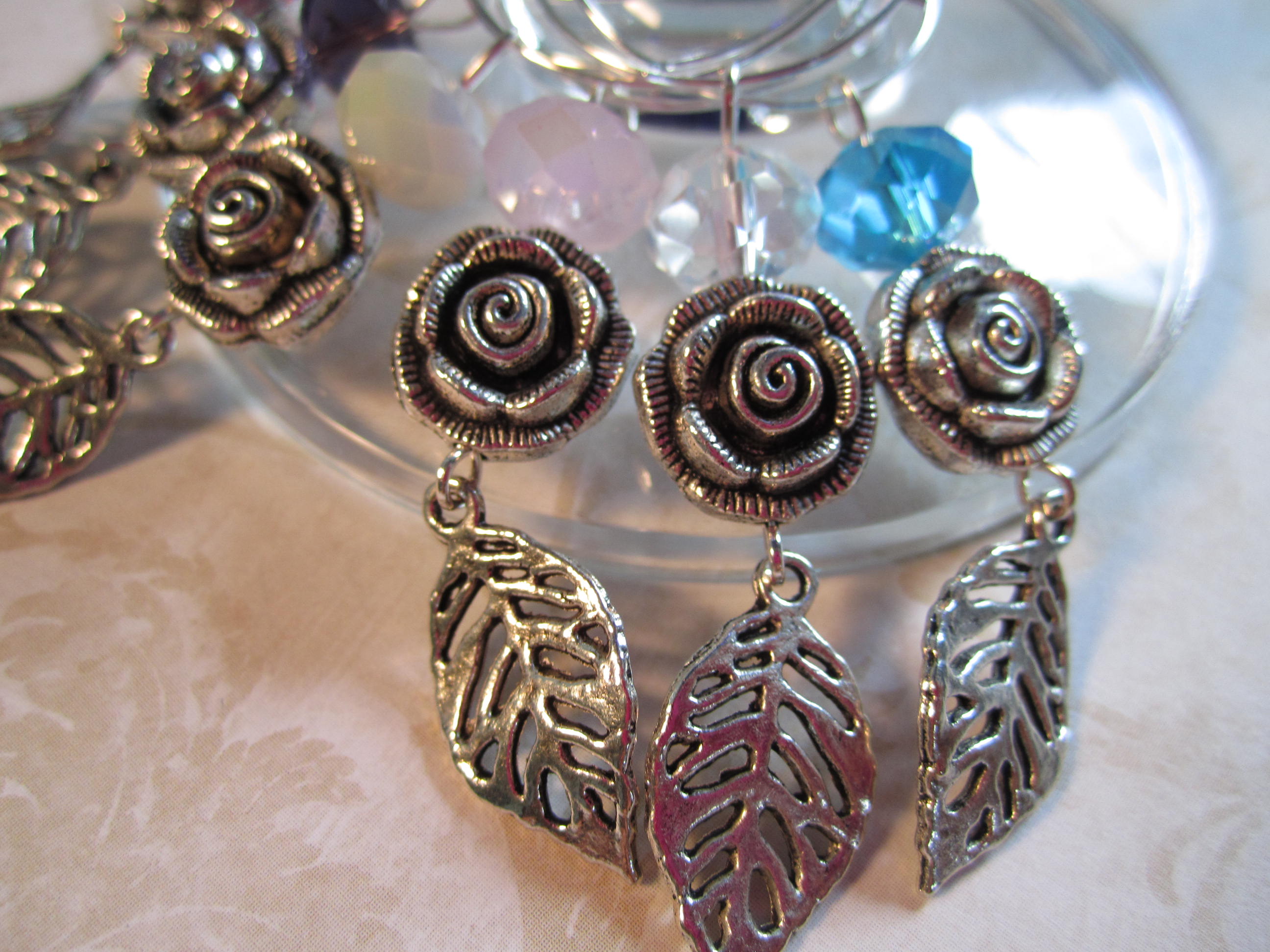 This was the first set, I combined two of my favorate things, the metal rose beads and metal leaf charms, they are both nice quality and the lady I bought them from said they are guaranteed to stay bright. I used glass beads in differant shades to compliment the lovely silver color. Even though they hang off the glass, they do not catch when you set it down.