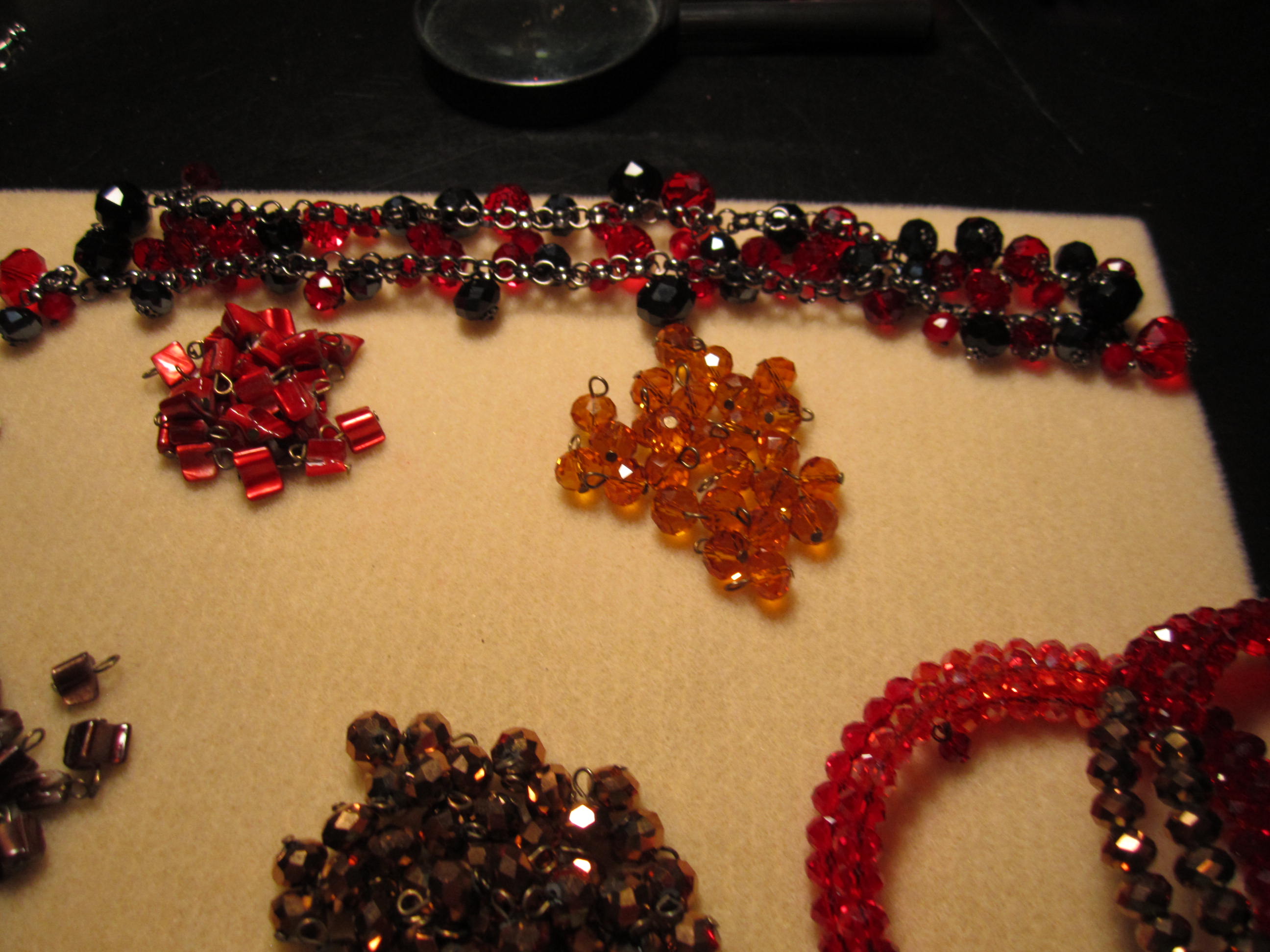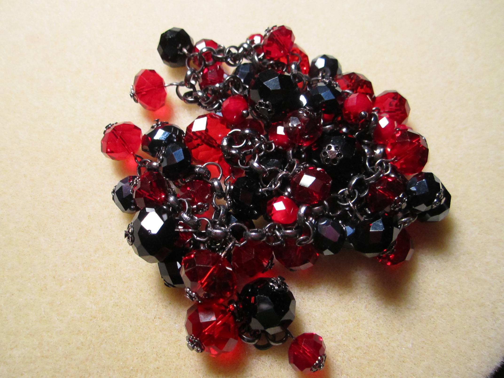 An elastic bracelet that I discovered was glass beads with bead caps, on a really nice metal chain, with elastic pulling it together. Cut the elastic and got a long chain with all these lovely black and red faceted glass beads with tiny bead caps on them. Not sure what I want to do, but wow , also a 20 dollar original price. I forgot to take a picture before I cut the elastic threaded through it. Rich deep cherry red and black glass faceted beads, the chain is that kind of black glossy metal .
