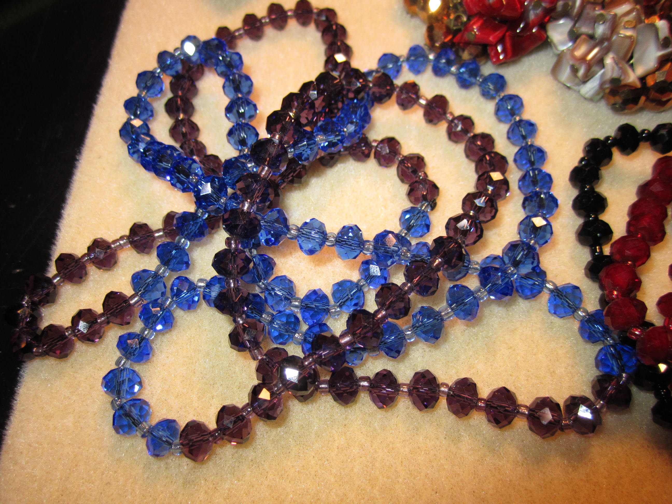 I got three really long necklaces, two blue and purple, one black and red, for five bucks each, originally 24 bucks each !! Seed beads in between. I have taken apart the black and red, but not the blue and purple ones  yet.