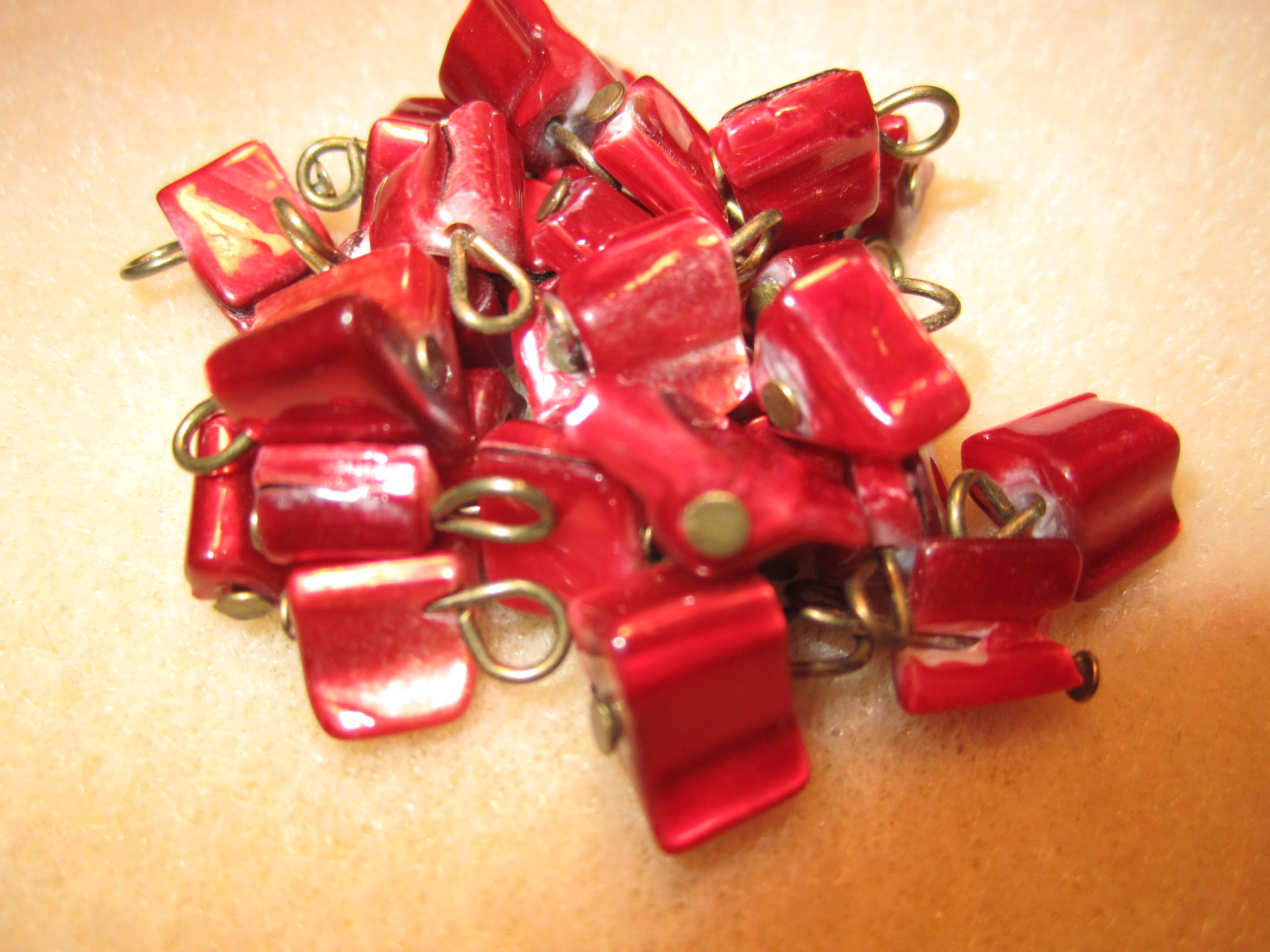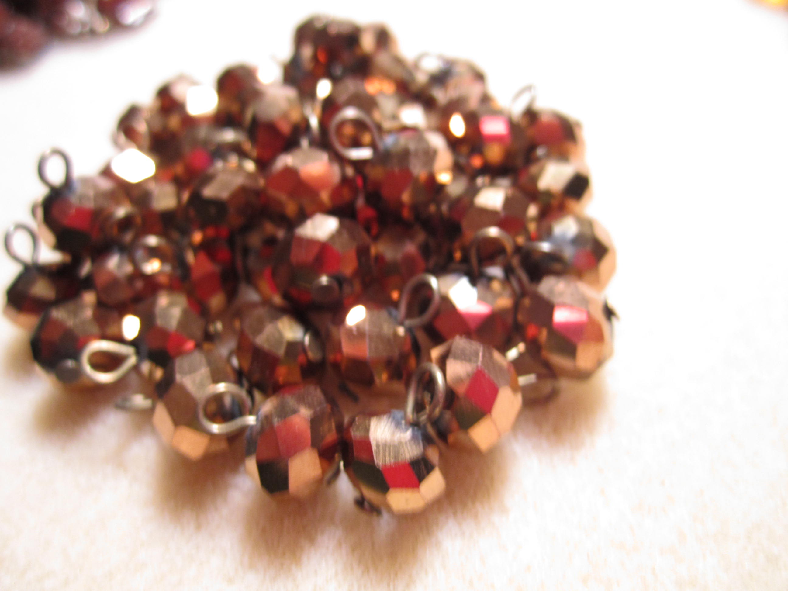 Two faceted glass beaded memory bracelets in three of  the most gorgeous colors,  red , an orange ab finish and smaller version of the metallic brassy beads I used in the earrings. I took them apart and got a nice big pile of each color between the two bracelets and have that wonderful memory wire to use as well. Three bucks each on those too. They had an original price of 20.00 each, wow !! I saved 17.00 each on the two I got. I wish the camera could have caught the colors.