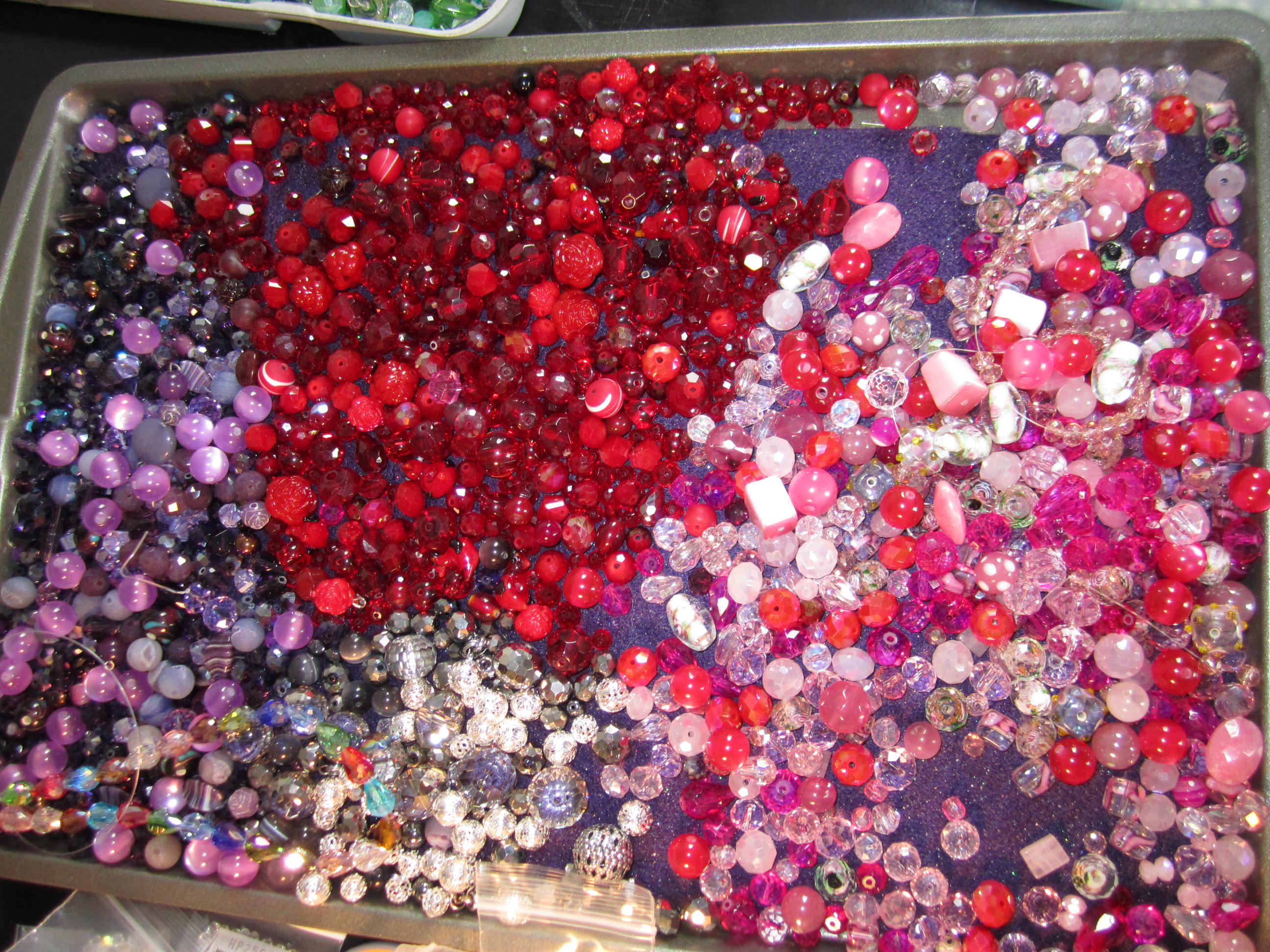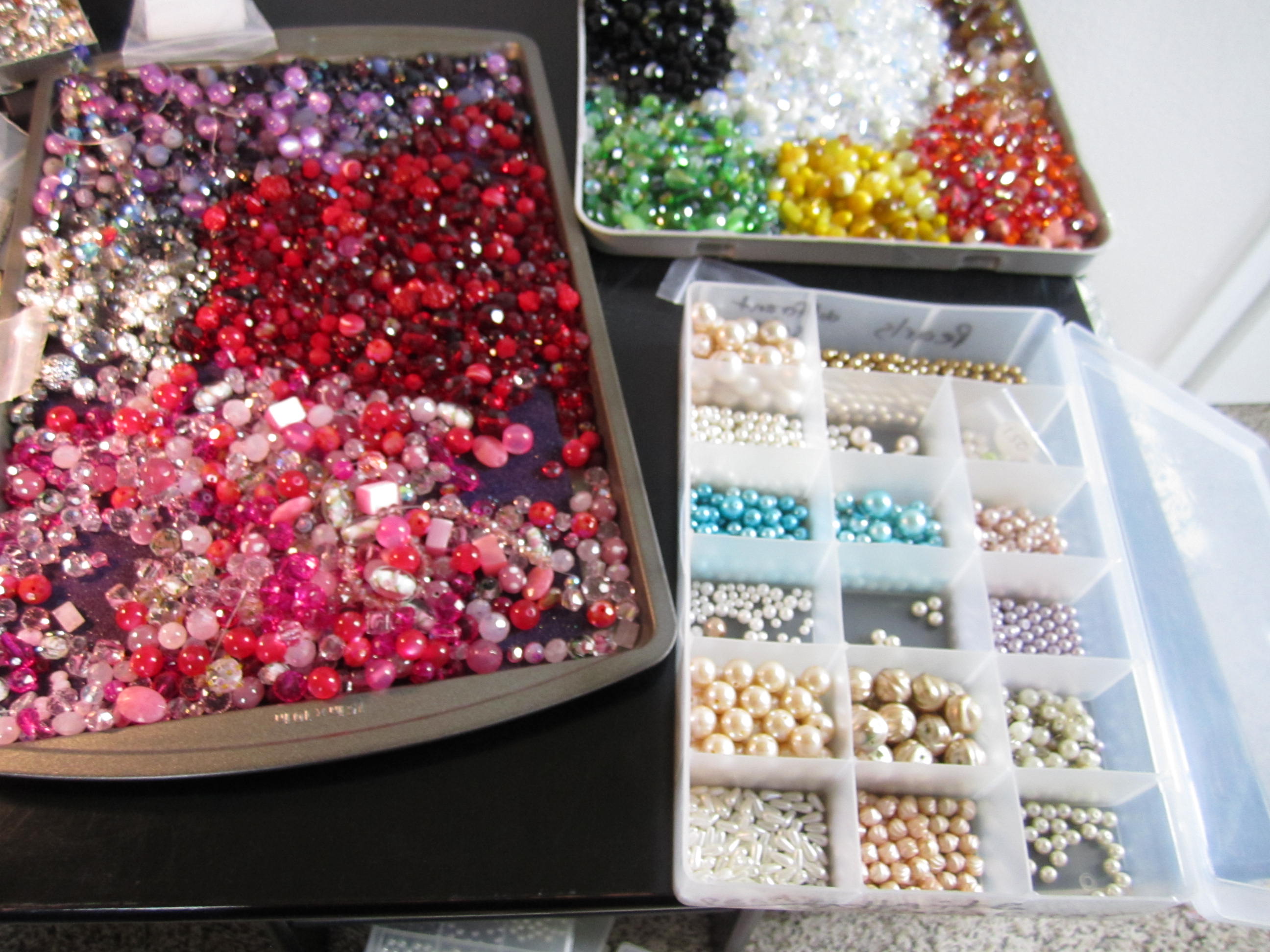 Some necklaces I have to take apart to use, small boxes of differant charms and findings, some clay projects and some decoupage projects , a matt of beads I was using, along with findings and charms, not to mention two full trays of beads, but those I will leave the way they are, they come in very handy when I need to make something quickly. All the colors are on the trays. Very handy, espeically when I quickly want to make a pair of earrings for an outfit.