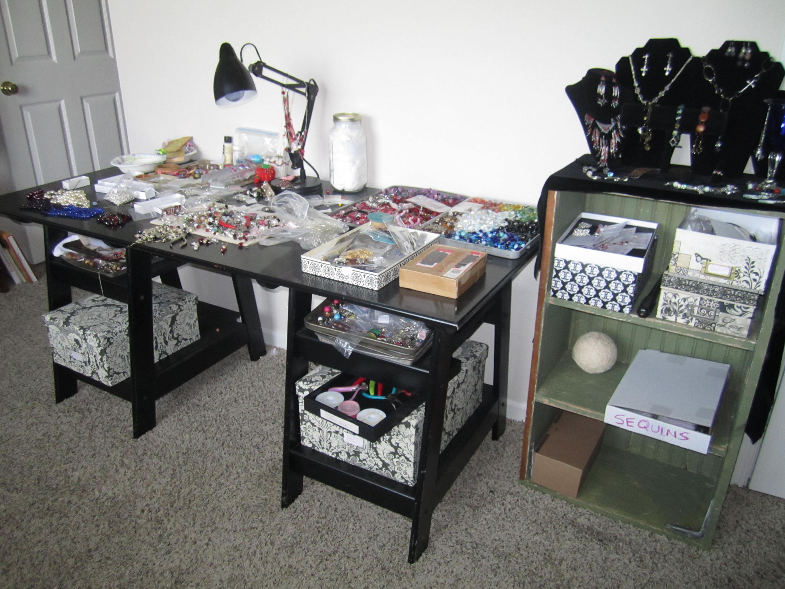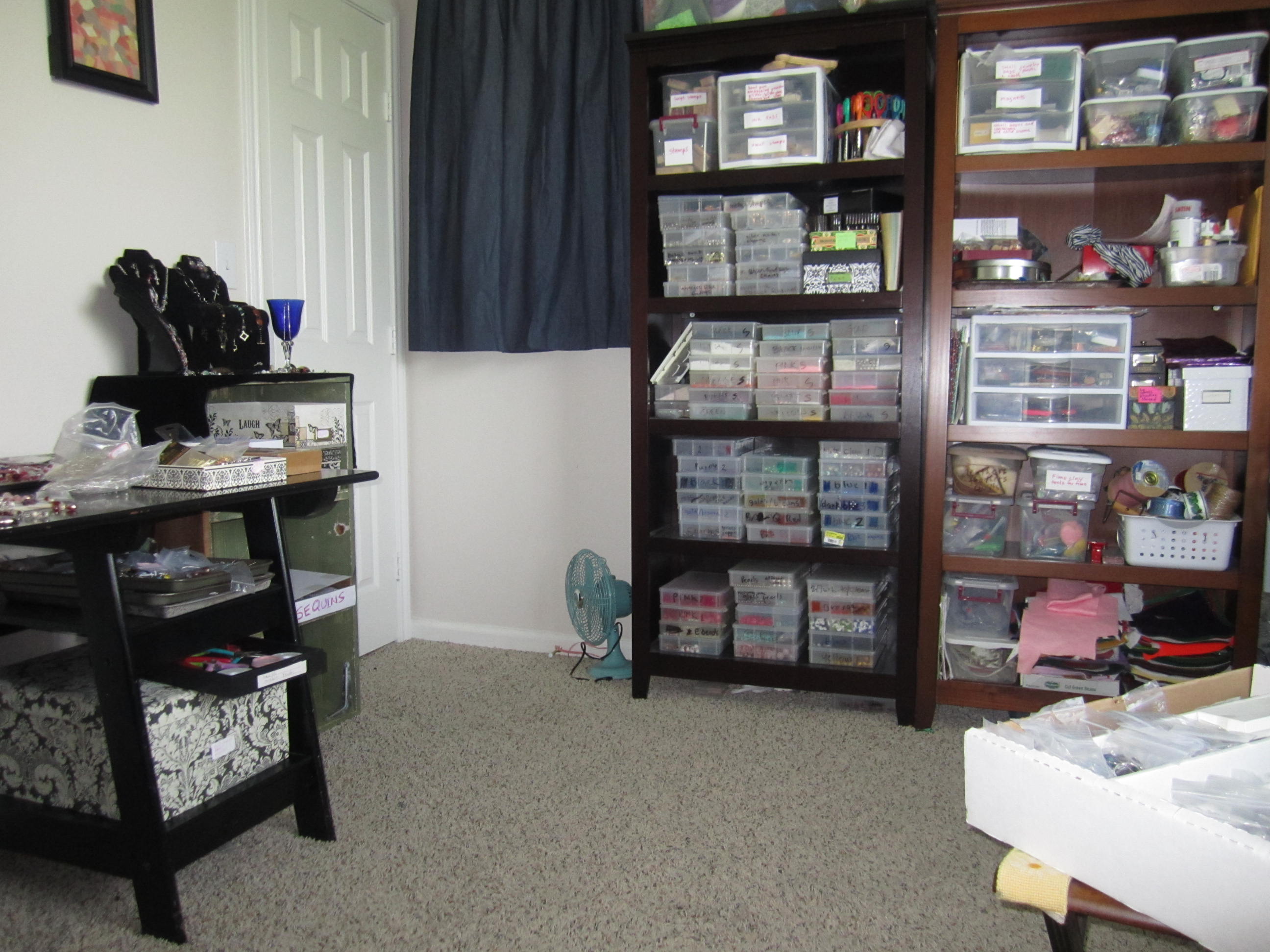 you can see trays on my shelves, more mess, lol !! Projects and beads and all kinds of stuff.