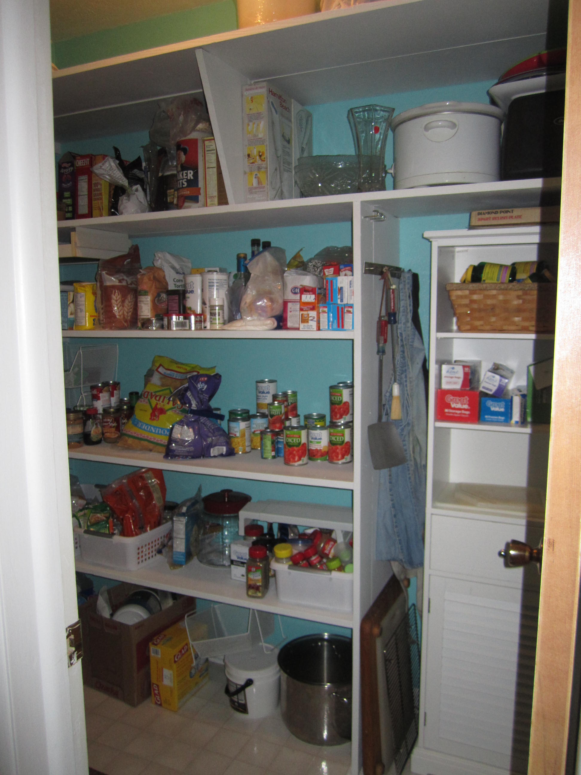 pantry repainted and loaded this weekend !! Yes, that is a yard sale sticker on that vase, lol !!!