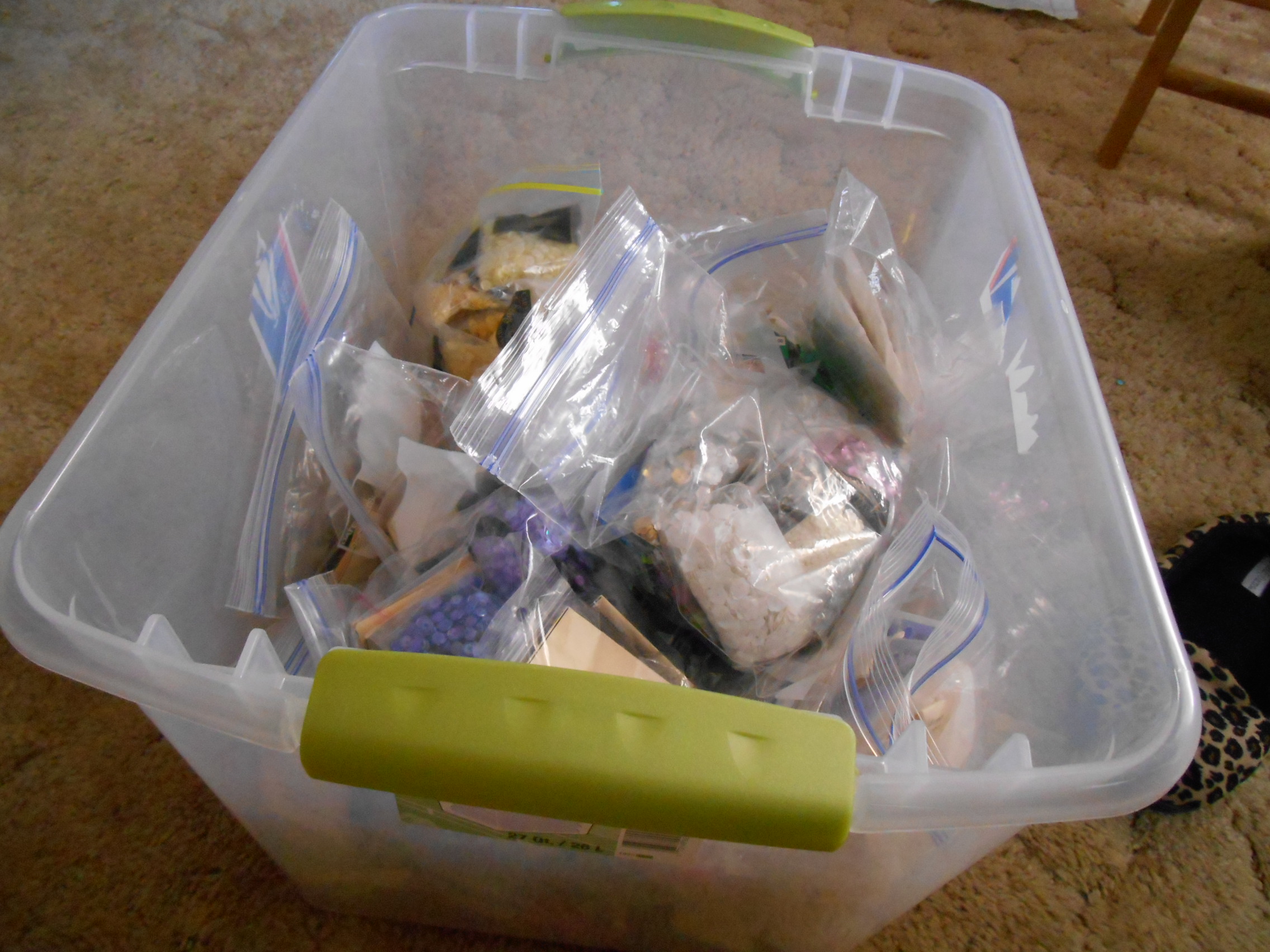 Let me start with the box I recently had to put them all in as the plastic shoe boxes were not working any longer !! I showed the label so you can see , it is a nice size plastic tub !!!