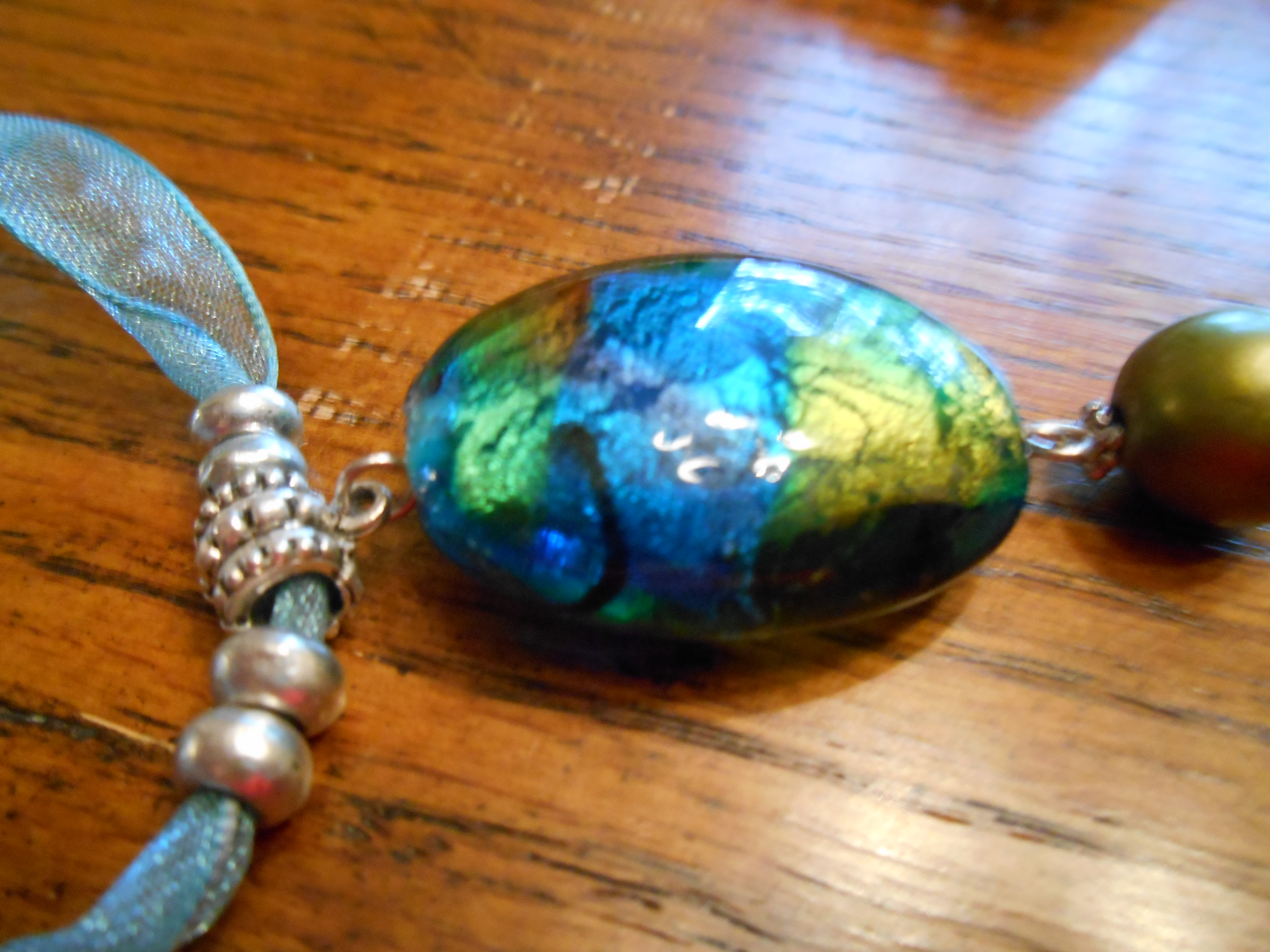 I thought this ribbon Β necklace had some nice items I could reuse on new pieces !! It is a glass pendant with some double beads in a silver finish and a gray pearl hanging from it !!