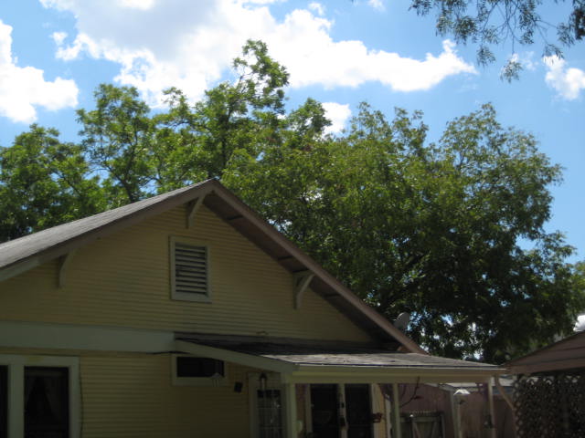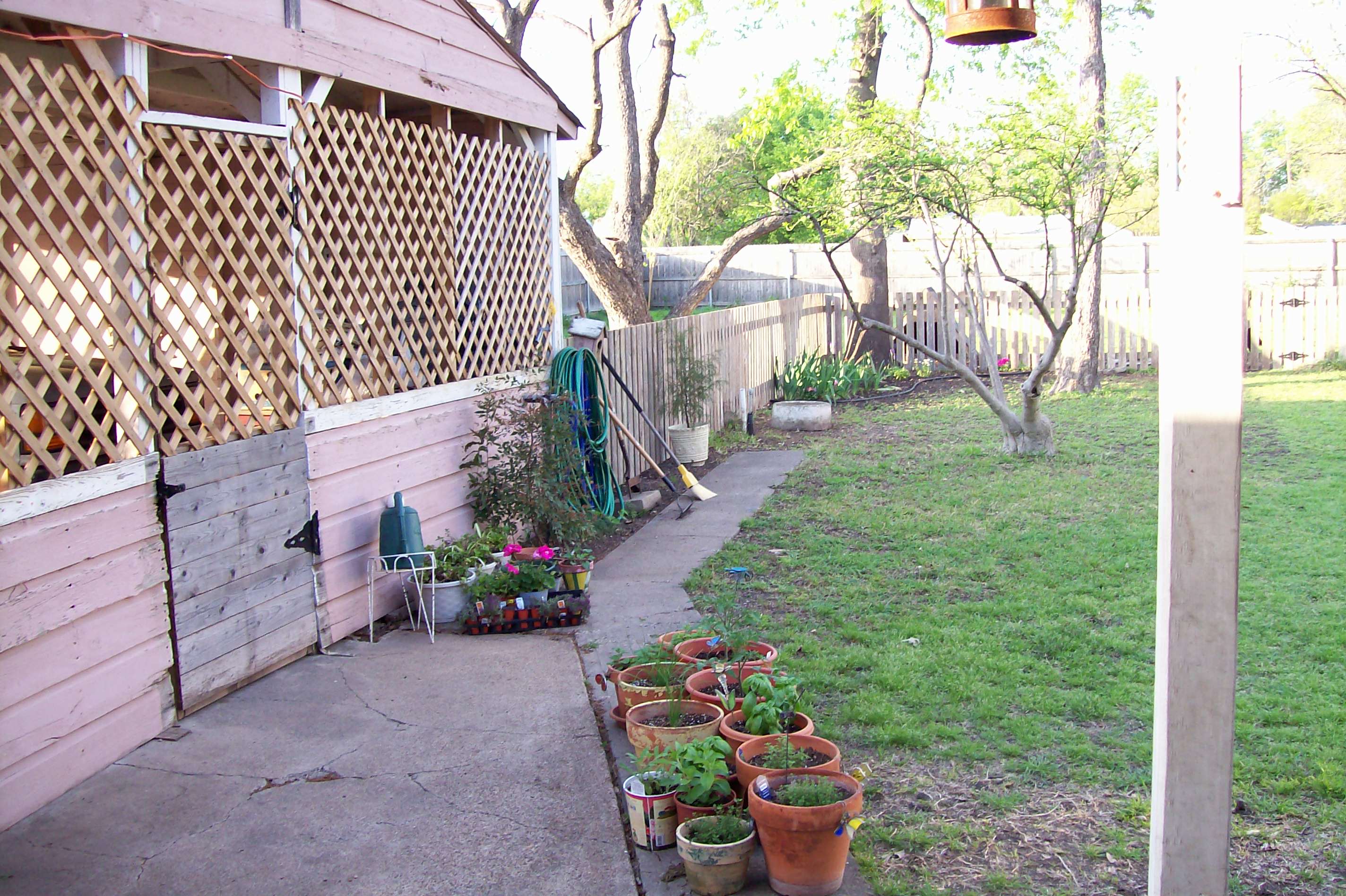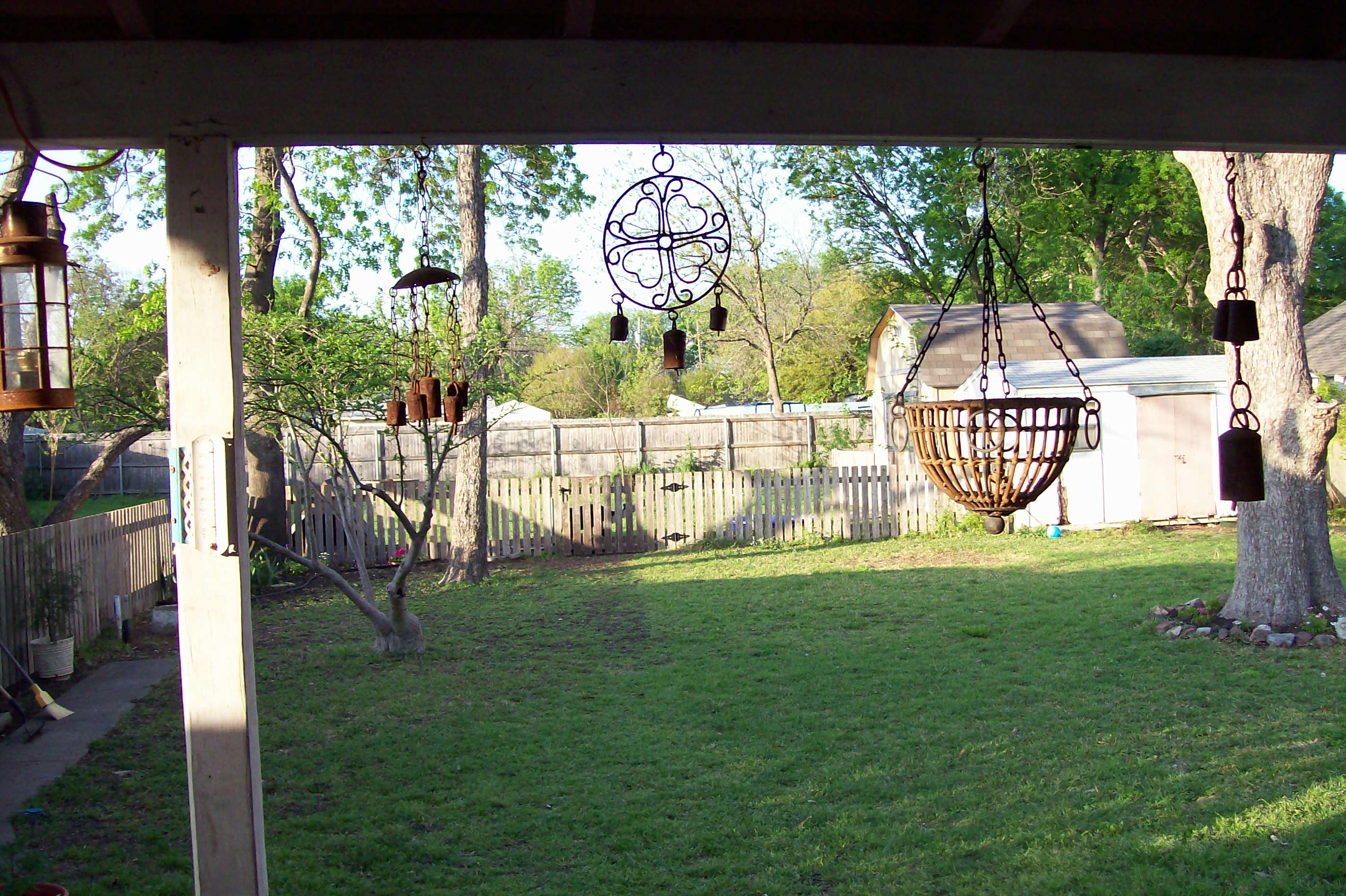 the back of the house with all our pecan trees !! We have six pecan trees that produce, an oak, five crepe myrtles , a flowering pear, and Oklahome red bud and a Hackberry tree on our almost half an acre lot !! But we still have a lot of grass !!!