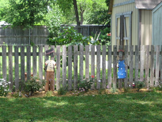 this fence divides our yard in half. we plan to put a pretty trellis out of old doors to charm it up. We still have the boy and girl stored away, so they will go back and we will replant this flower bed, it does not looks so nice right now, but that will be done quickly !!