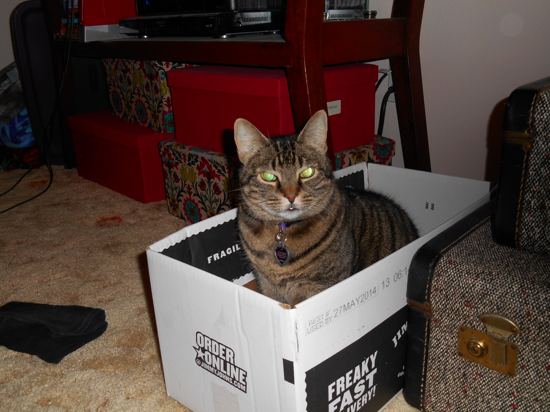 and here is a picture of our cat sitting in a box, because , well, you just never see cats sitting in boxes, lol !!! I think if there are a box and cat both in a room, it is inevitable. They will also sit on a piece of paper on the floor too, pretty funny creatures !