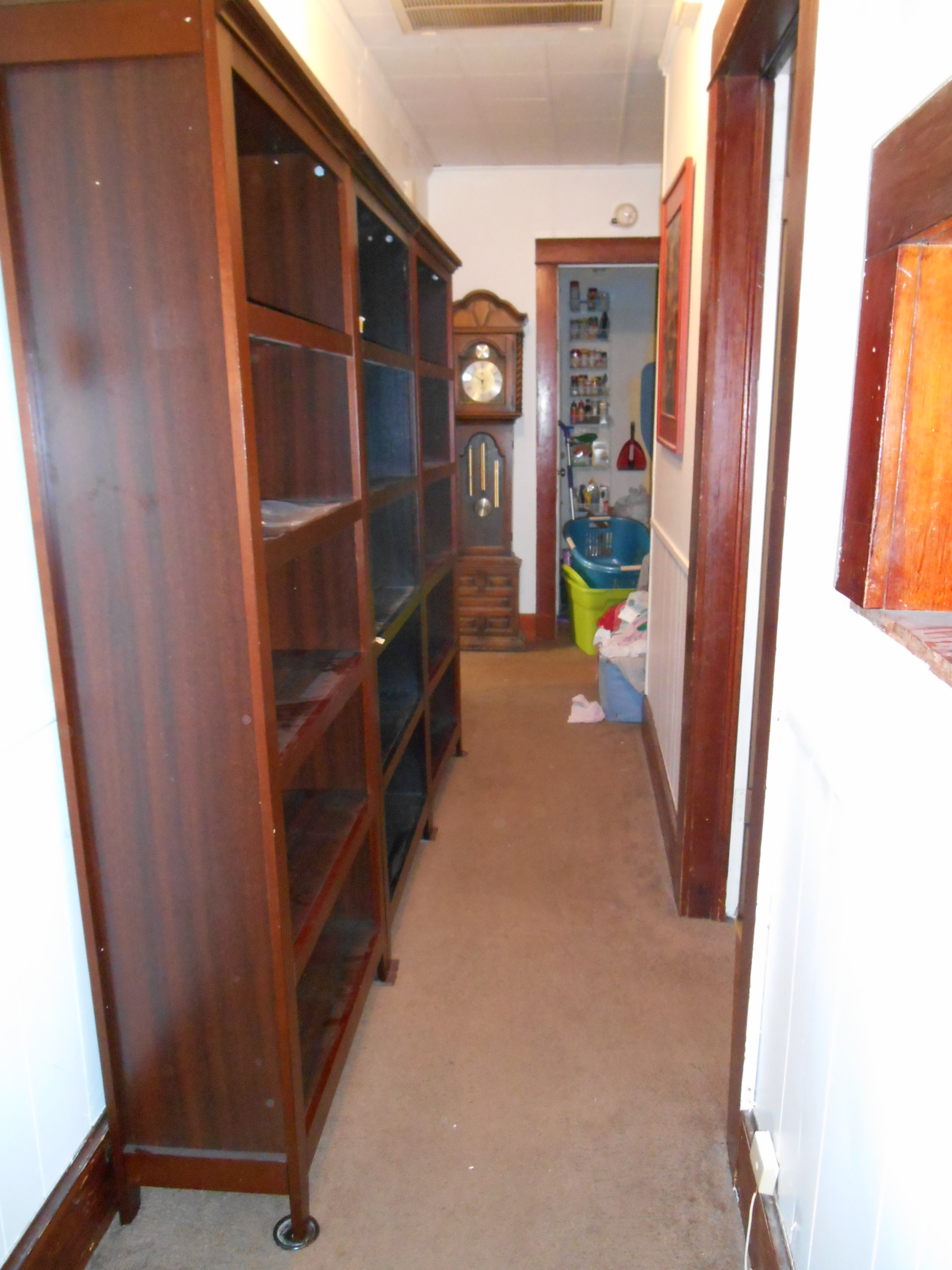 Three of the book shelves from the other living room are down the hallway now, we just have to load them with books. The house needs to be swept and vacuumed from all the moving around and there are still boxes and bins everywhere !! I cannot wait until I show an upsdate with no boxes or stuff laying around !!! You can see the laundry room at the end of the hall, the kitchen is to the left of that clock and the front bath is accross from it and the door you can see is the kids play room,