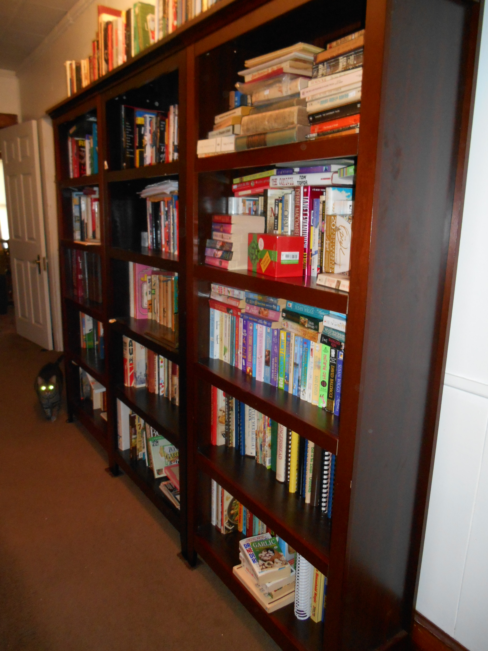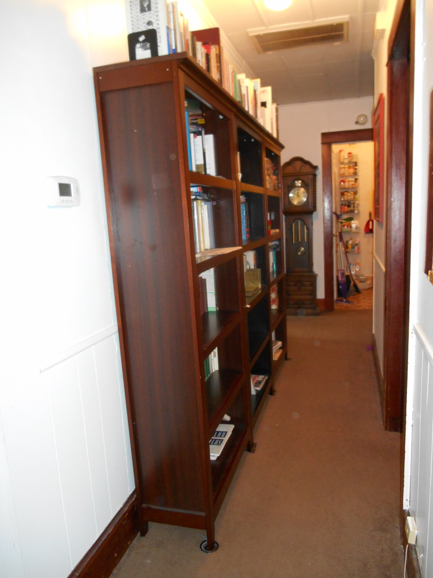 This is the set of book cases in the hallway between our bedroom door and the door to the family room, our own private hallway, I took it standing in the bathroom door of our master bath.