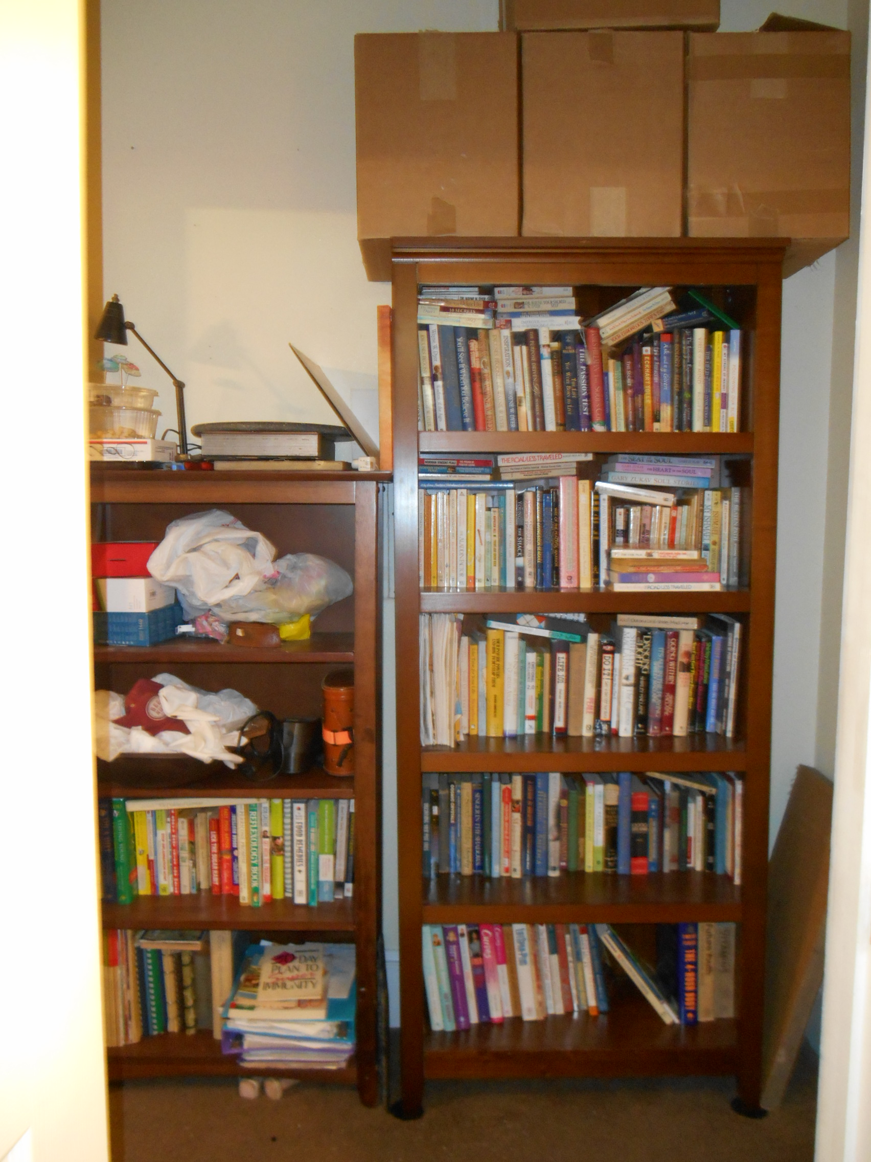 I have all my spiritual books, self improvement books, and all kinds of neat books, cook books and lots of treasured books. The small shelf is my hubbys and he put some books on the bottom shelf and then the rest is still just junk piled, same with the top of my shelf, boxes we are going to store, those are all just one item per box, but items that were bulky and needed thier own box, but have not put out in our barn yet. One day at a time , lol !! I still have all our Bibles on my night stand, we have a ton of them, but they would not fit on this shelf, so they stay on the bottom of my night stand.