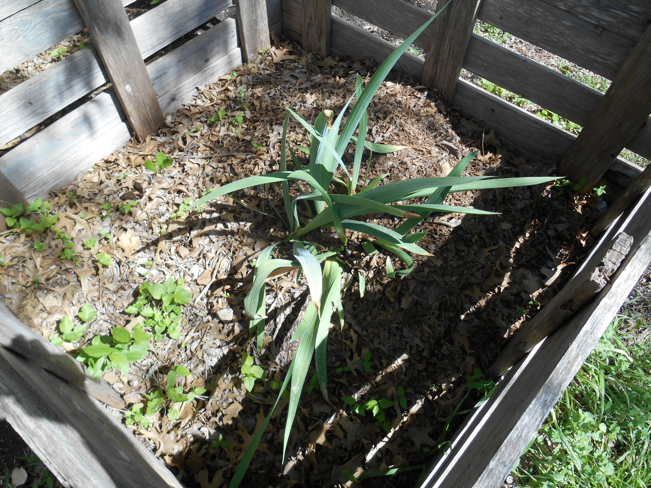 Our old compost bin, we have not used it for a while and now an iris has made its home in it !! We will have to transplant it to another place !!!