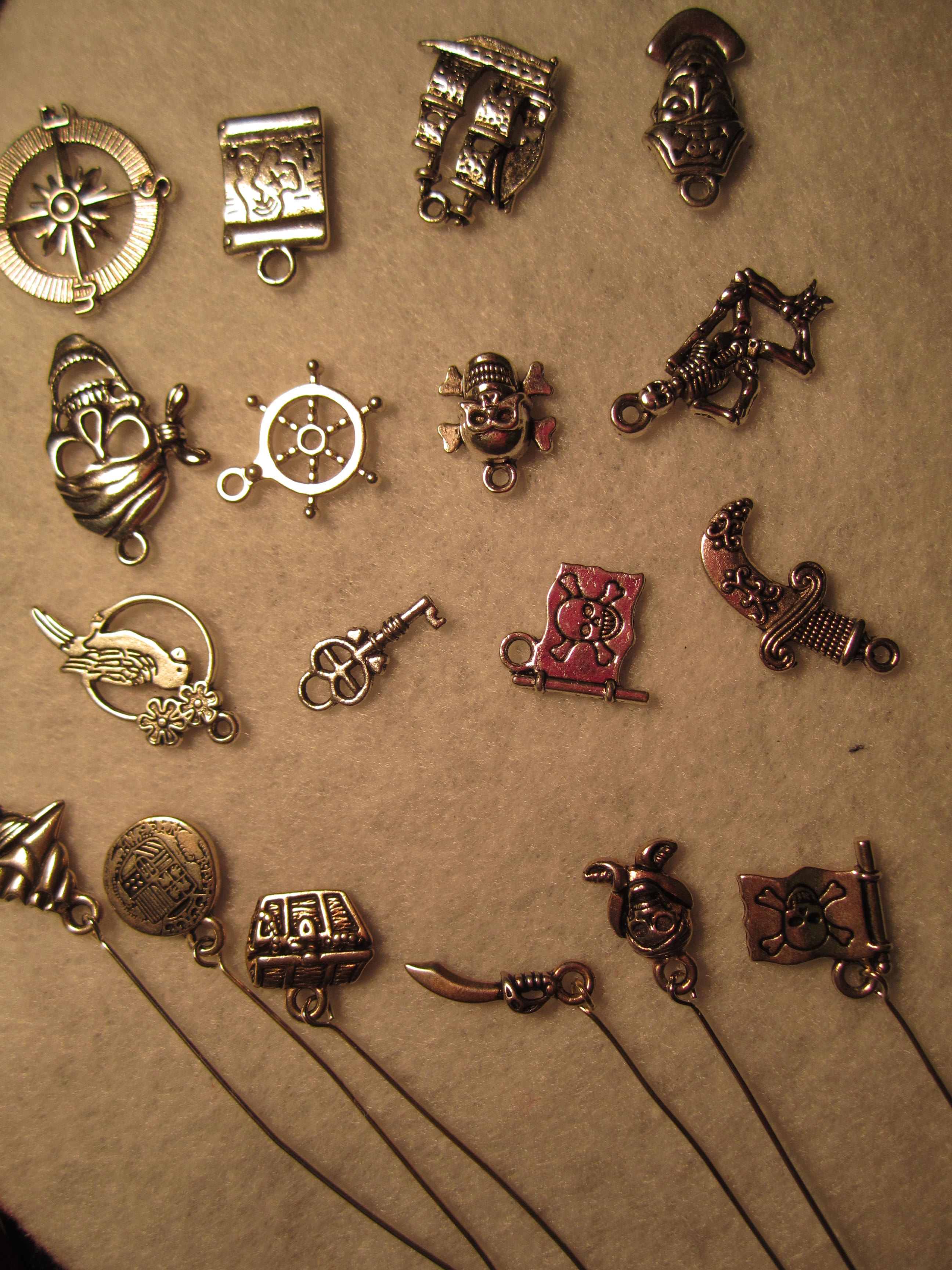 I am also making some custom wine charms, so fun, for a customer in a pirate theme, so much fun, here are some of our charms we are working with and she is deciding which she wants to use !! Black and red is the color scheme and what fun this order is !! I had strung one set on head pins to put beads on and then I had found the other charms, so I am waiting to see which ones she choses. I have a set like the head pin set already made up in black, but if she choses to use the ones in the picture, I will relist those on Etsy.