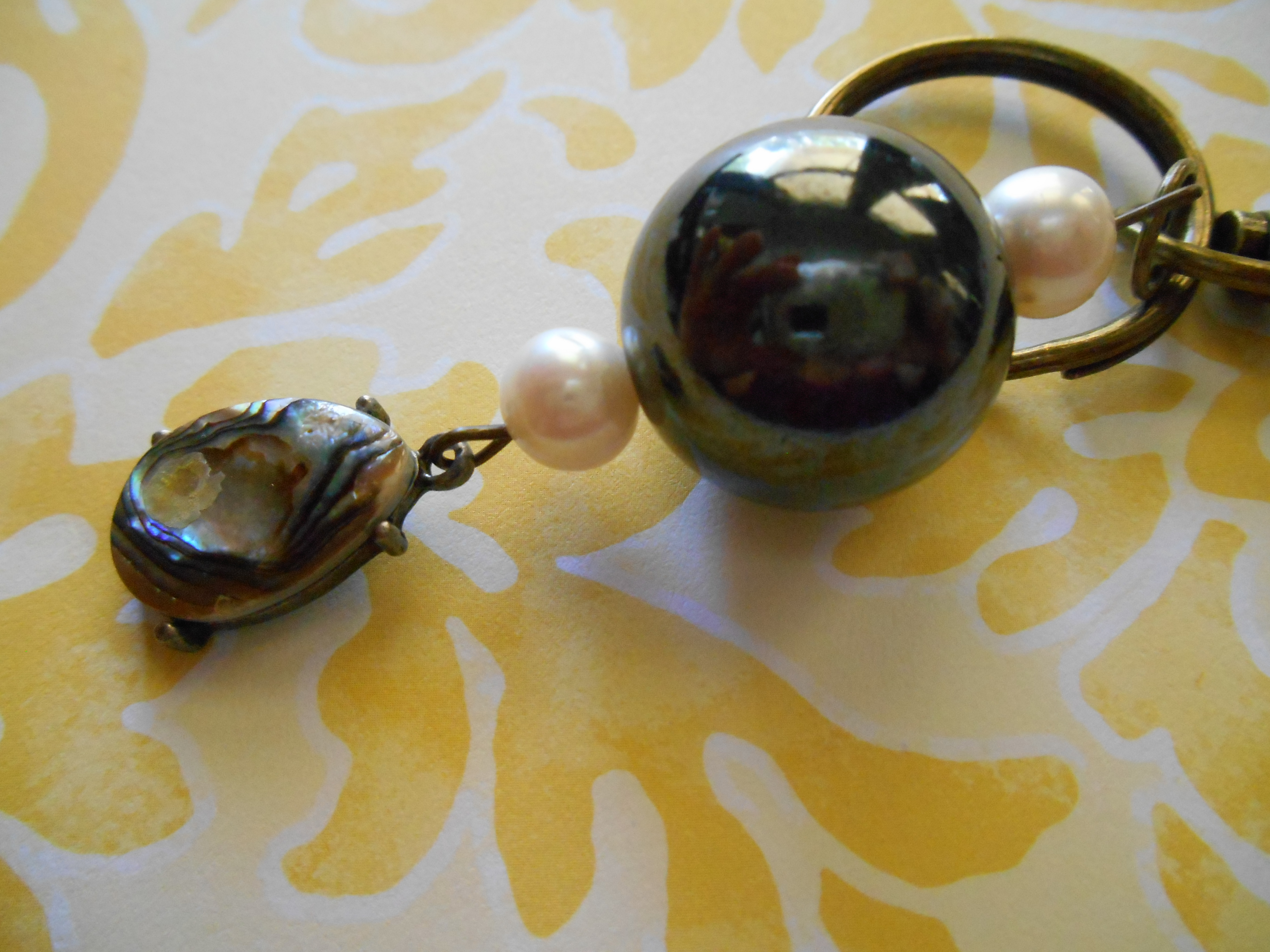 THis next one is a really pretty one. I used a huge hemetite bead, with two cultured pearls and a pendant charm made from abalone shell, I took it off of a necklace I bought on clearance from Chicos, and original price of that necklace was very high, so it is a quality piece and I have used bits and pieces from that lovely necklace for many of my creations the last few years. I used antique brass to match the setting on the abalone and it is a pretty keychain.
