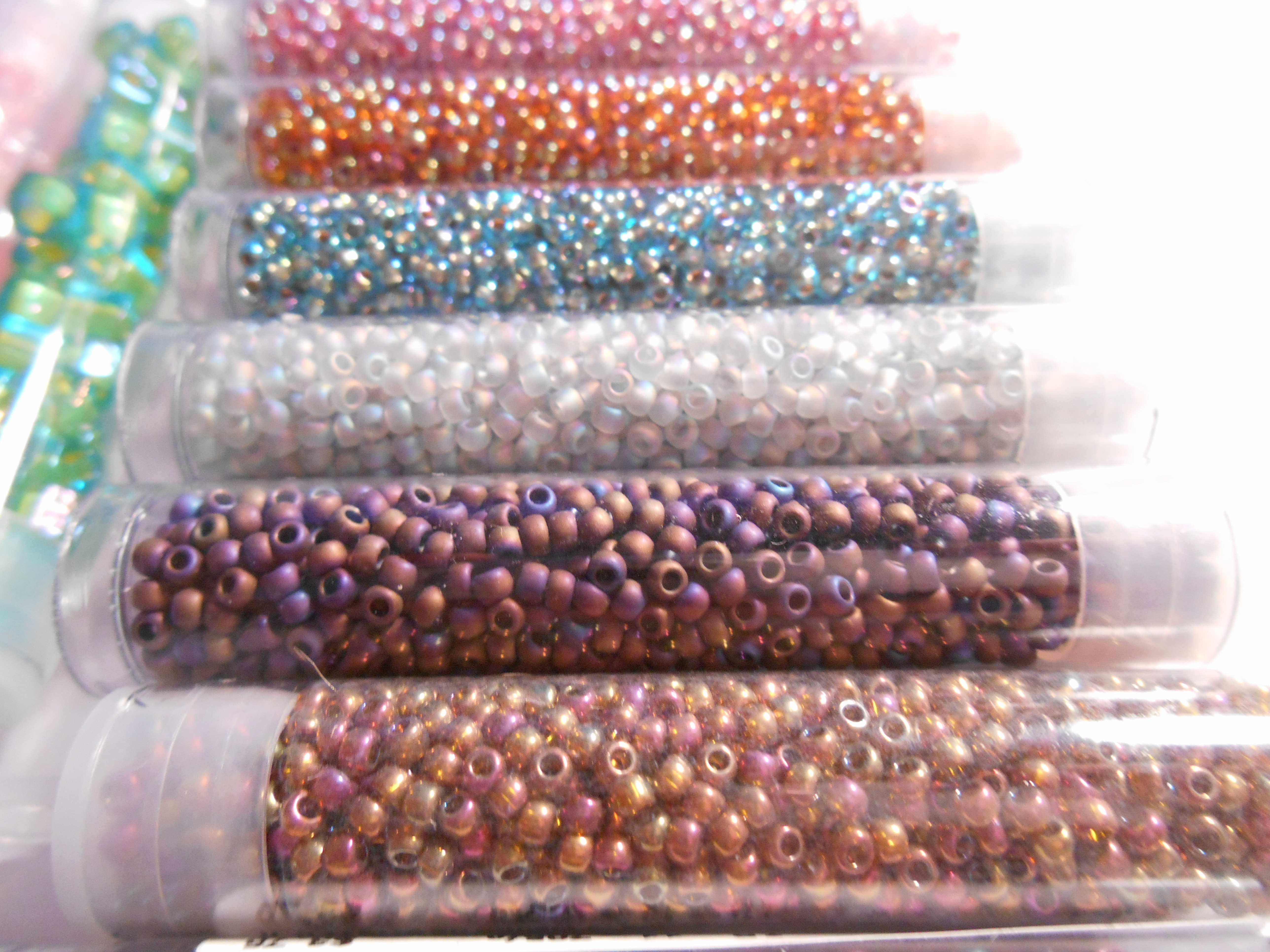 I love seed beads and have been collecting and beading with them for almost 25 years now. I have a customer I am working with and we needed purple seed beads for a part of the project and when I looked I realized I needed to start adding to my seed bead collection. When I started all I could get were seed beads in the craft stores and if we wanted to take a bit of a drive there was a lovely store that sold American Indian items along with the craft supplies to make American Indian projects and I could get tubes and hanks there but with four small kids money was tight and I got what I could. Now a days, there are so many more colors then I could have even imagined back then so I had fun picking out now only for my customer but for me. Lets be real here, I need maybe 50 seed beads or so for my project so even the tubes I bought to use for my customer will be hardly touched, so they all go into my collection.