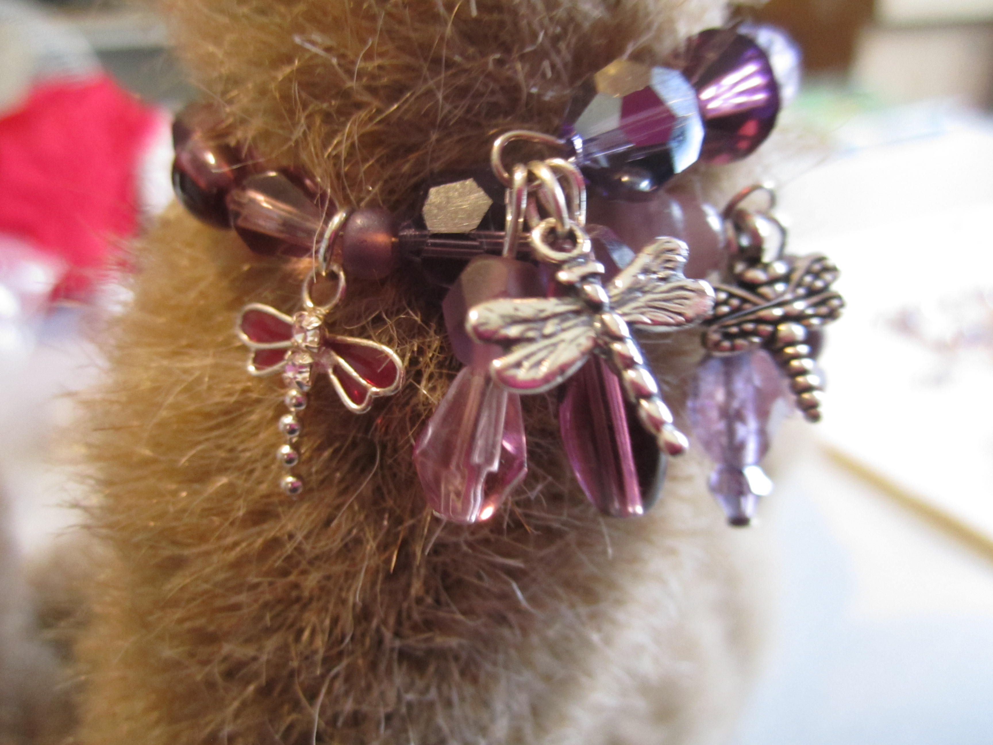 She has two stuffed animals from when she was young, gifts from family that mean a lot to her , and she keeps them on her bed and she decided they needed a little sparkle too, so she asked me to help her design some cute jewelry for them and this is what we have come up with.