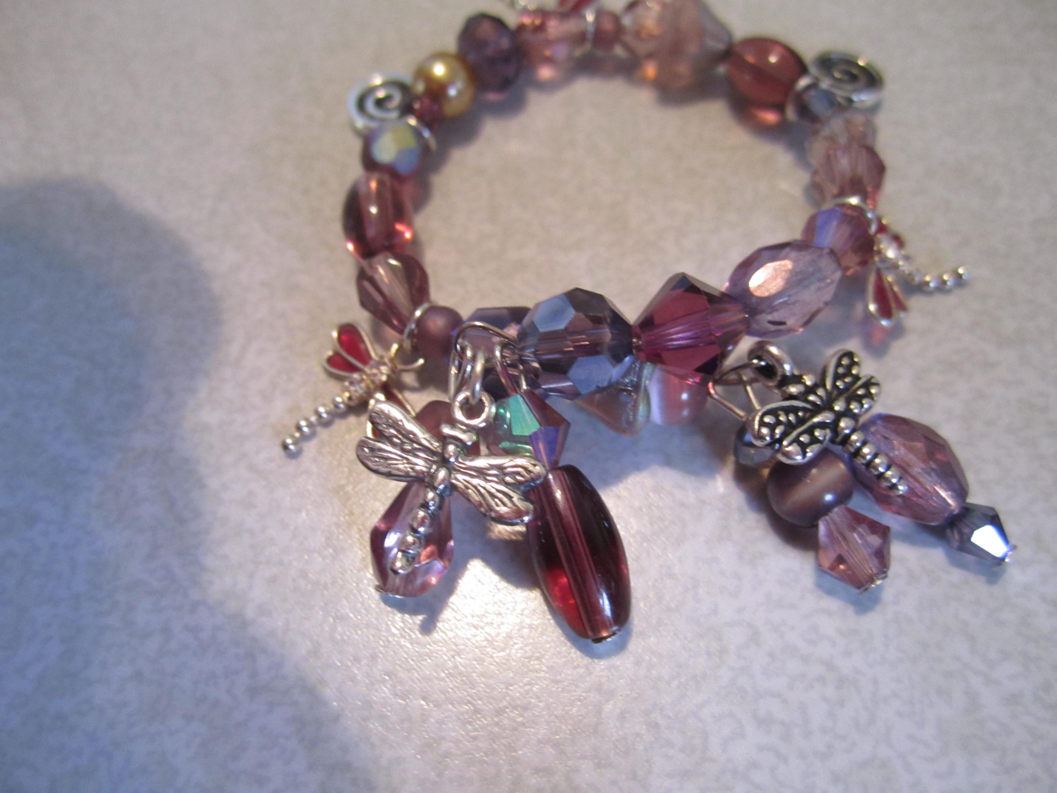 four dangles, four different lengths, will hang on the big dragon fly connector , which will hang on a loop on a door knob of a closet. A lovely purple glass doorknob. My wine charms inspired this project which at first was small but got bigger as we talked back and forth and as she found so many pretty things for us to play with, I cannot tell you how pretty this is in person and I am so excited to put it together once we are done tweaking !! My new tool will help me loop all those wires, and then I will add a jump ring to the connector on both ends, add the dangles to the bottom and a large wine type hoop to the top.