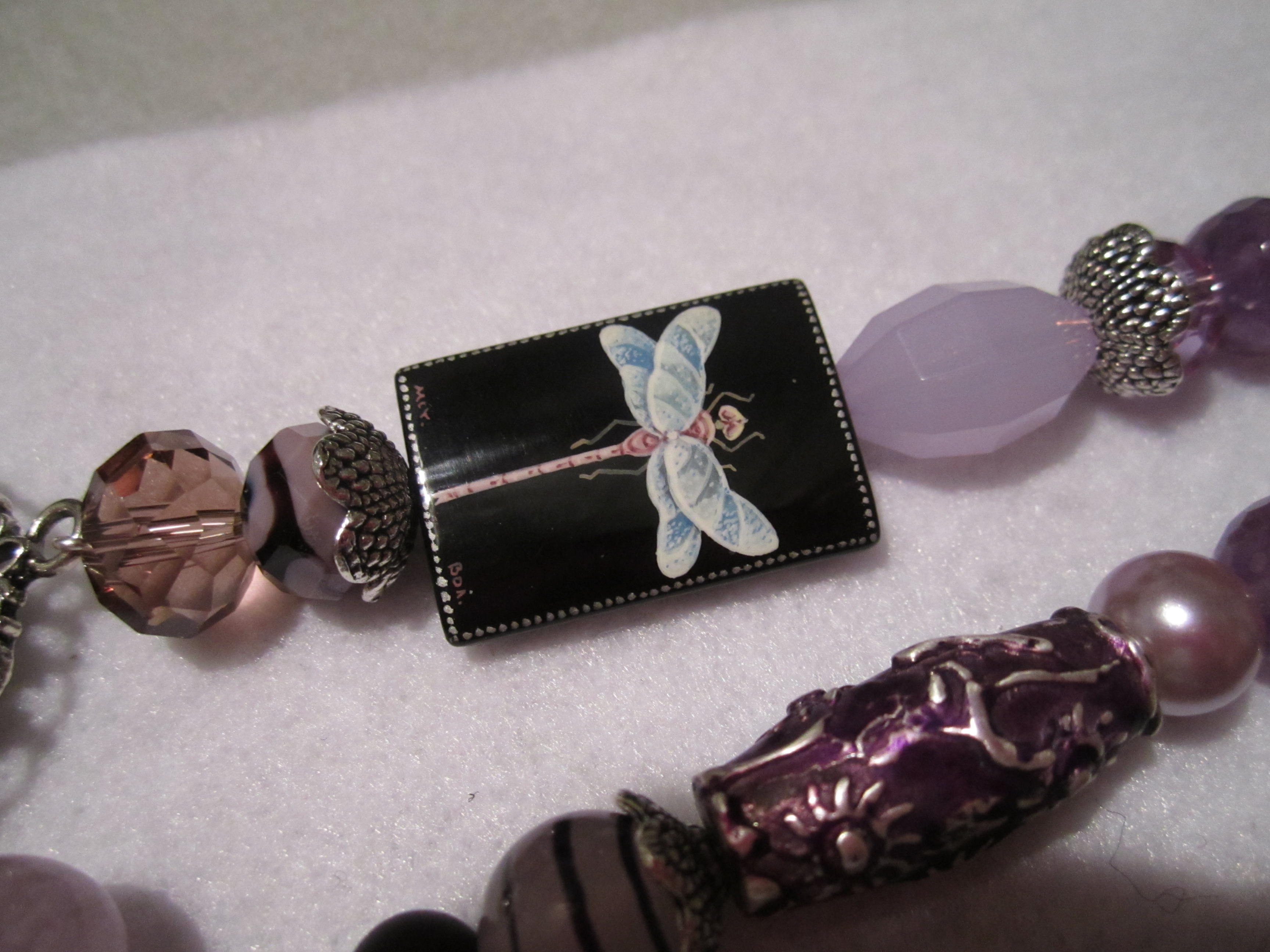 We decided that when I add the toggle I will make another small chain, like the bracelet and hang it off the jump ring of the toggle with the accent bead on the chain at the end, it matches the two in the focal pendant. We both agree you just cannot have to many beads !!! So, the lobster claw will come off and a lovely silver dragon fly toggle will go on !!