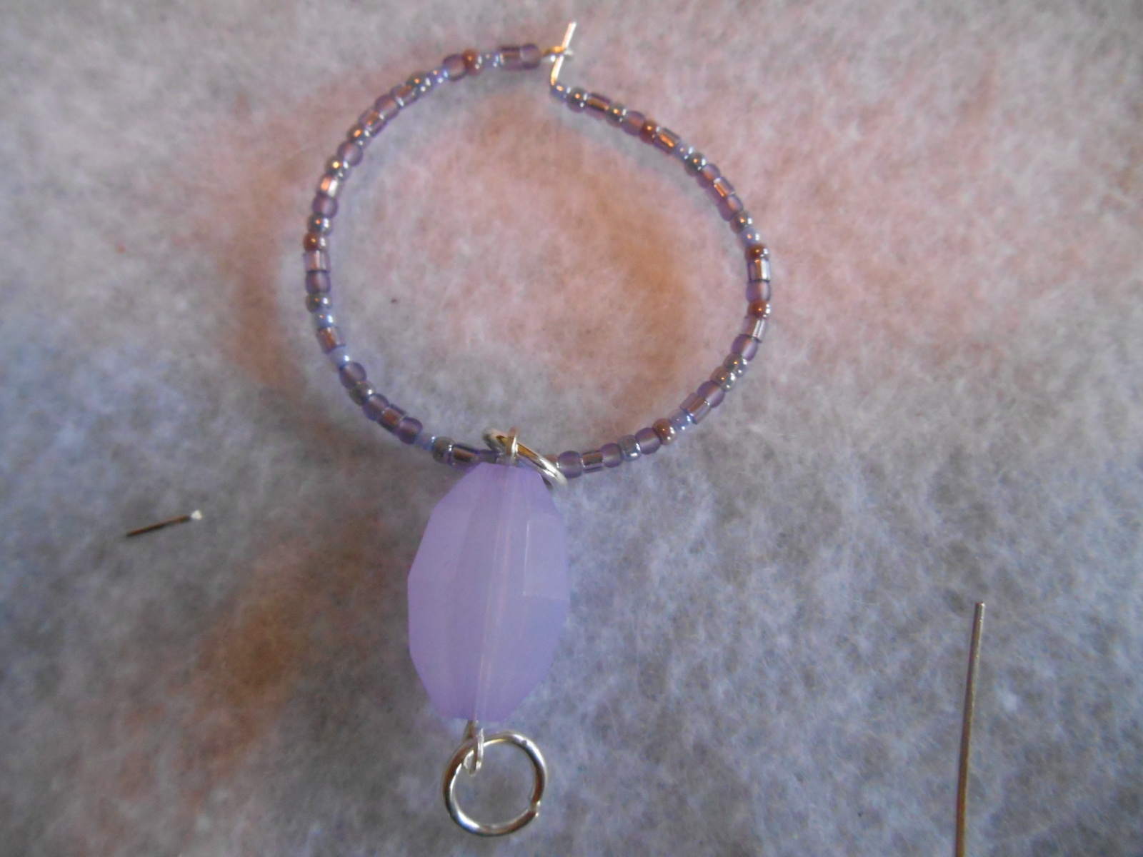 once she is happy, she will tell me to loop them, I will not do it until she says the magic words, lol !! Once I loop them I attach jump rings top and bottom to the connectors she chose, sometimes making a connector out of beads, like I did below, and then hook the charms onto the jump ring on the bottom. Then , using seed beads, I fill a loop with beads, and then bend it back up to keep the beads on, then I hook the top jump ring on and then are done !!!