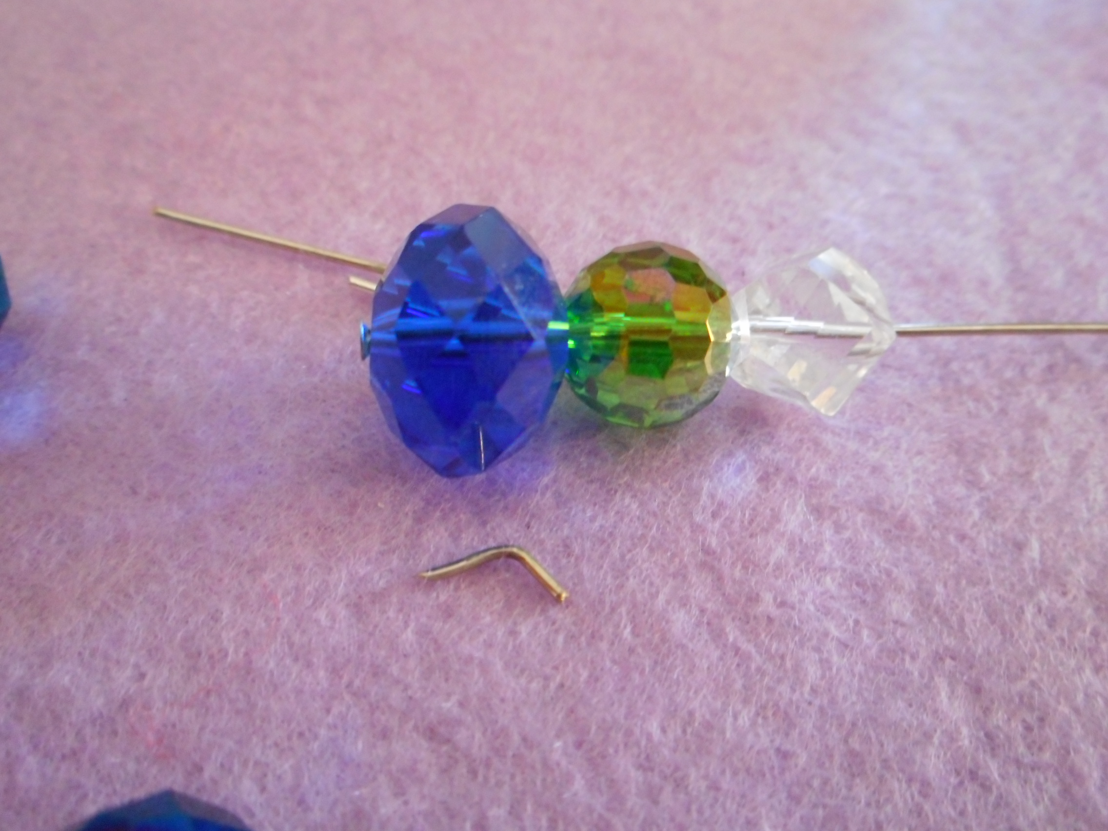 They are all glass faceted and the bottom beads have an AB shimmer to them, really pretty with large facets. The middle bead is a glass faceted twist and the top is a simple bicone crystal.