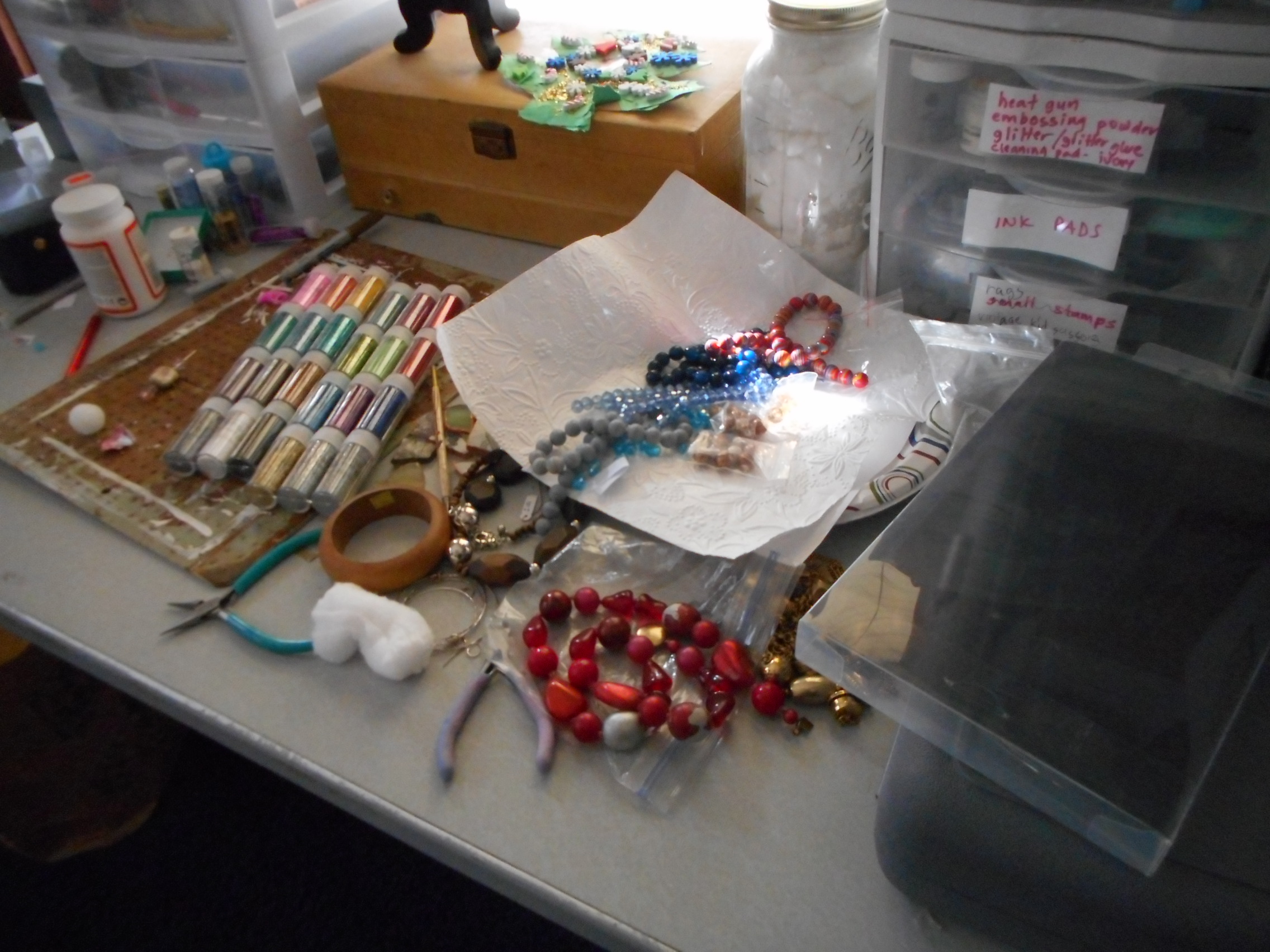 My work table. It has been worse, but that is not an excuse. I have to clean before I start another project. I can use the excuse I have a lot going on, but I have all the time in the world to keep my studio clean, even with things being a bit crazy the last six weeks. Â I just do not do it. I have moments when it is all perfect, and I am so happy and proud, and then within weeks, back to the dark side, lol !! The stuff in back is supposed to be there, but the other stuff, not supposed to be there !!
