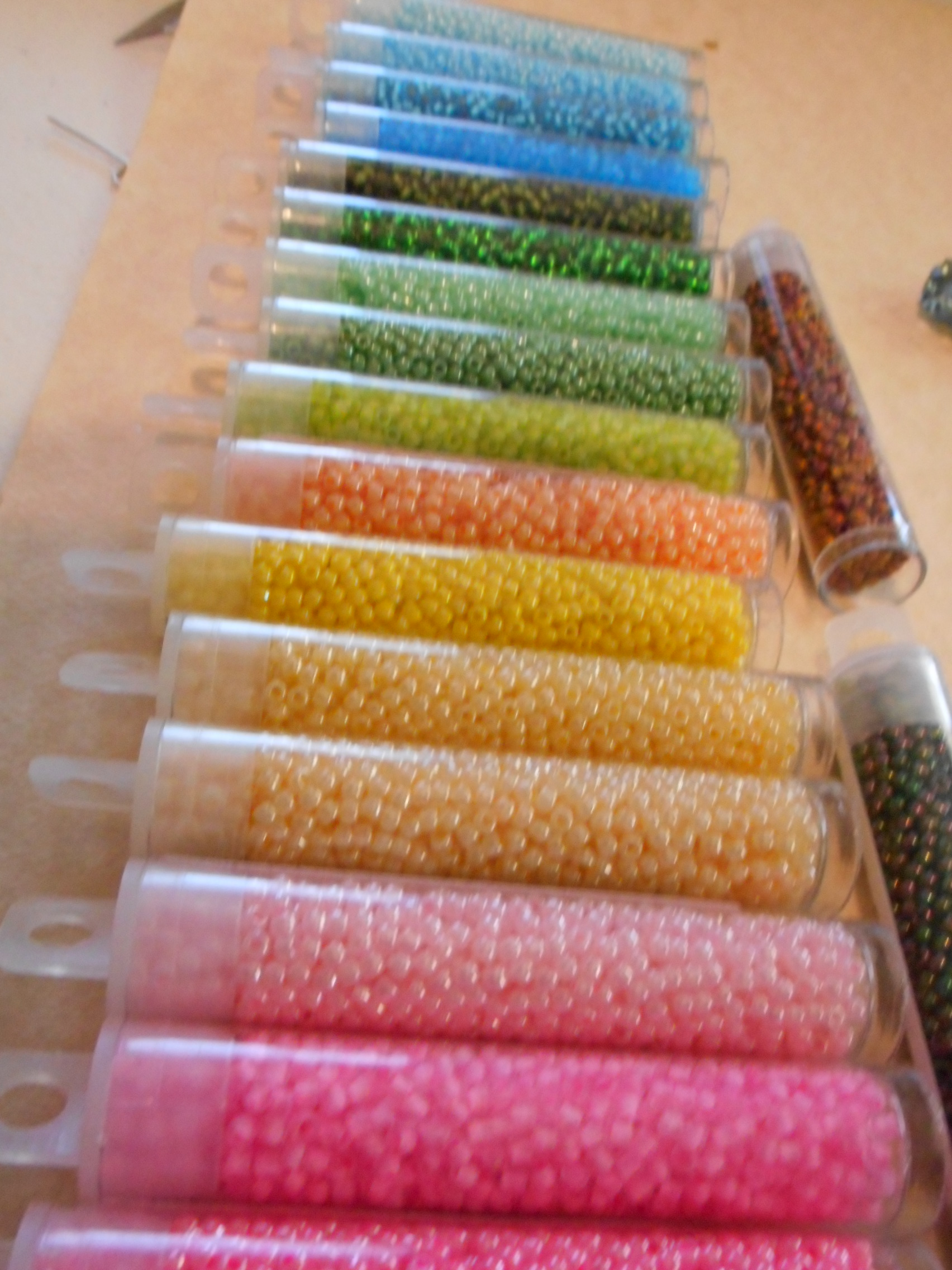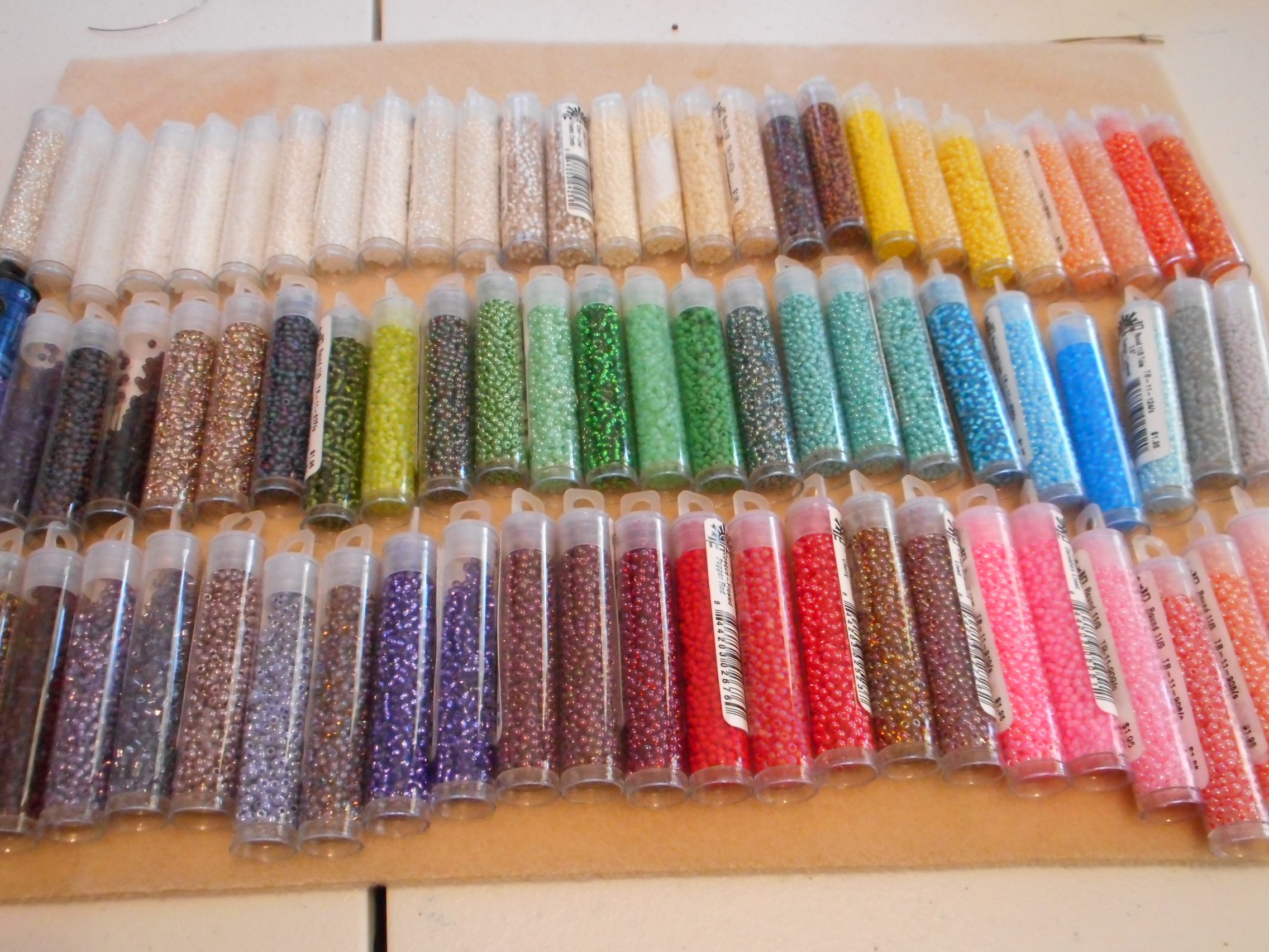 I have slowly buying sead beads from Lima. The many boxes of seed beads I have are all older, some 20 plus years old and they are not uniform like the ones you can buy today. I can use them for my seed bead work with sequins, holding a sequin on does not require it to be uniform, but to bead weave or do earrings, you want them to be very uniform, so over the past year I have been adding. I added a ton of purple when I was doing the dangles for my cusomer , all the wine charm loops I did with seed beads. I am fascinated with white and have since purchased every white seed bead they sell.