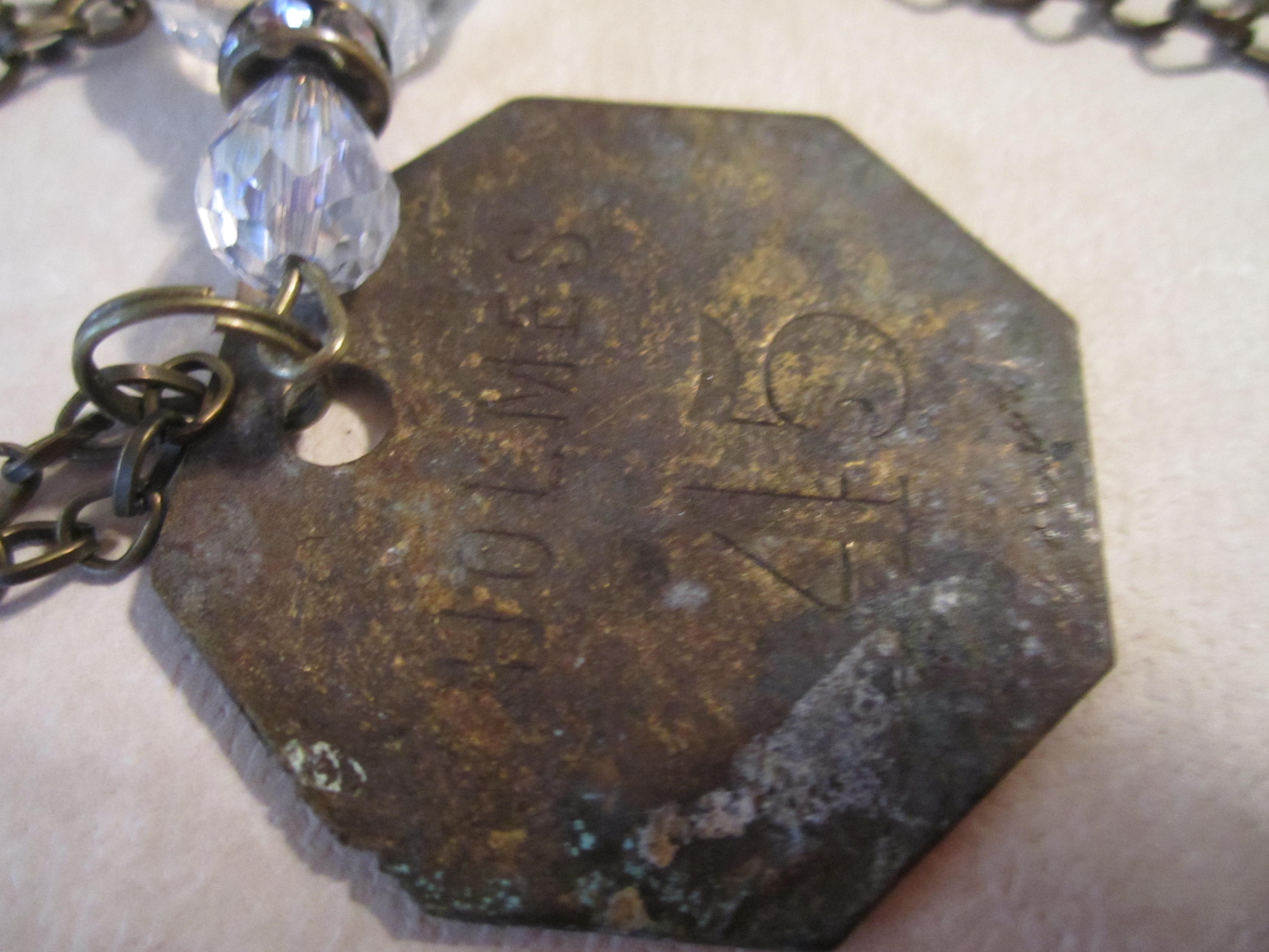 The next one is really neat. I scored some vintage brass miner tags. The miners each had thier own tag that they hung up when they went in the mine and removed as they left for the day. That is how they kept track of who was in the mine. I loved this one the most, it has the most pantina on it, but they are all wonderful !! I have mentioned before how in love with the scalloped beads I am, here is another use of them. love it with the vintage brass !! the rhinestone spacer looks pink but is all clear stones, but my pink camera reflected in it !! same with the  beads, they are clear and sparkly, NO pink.