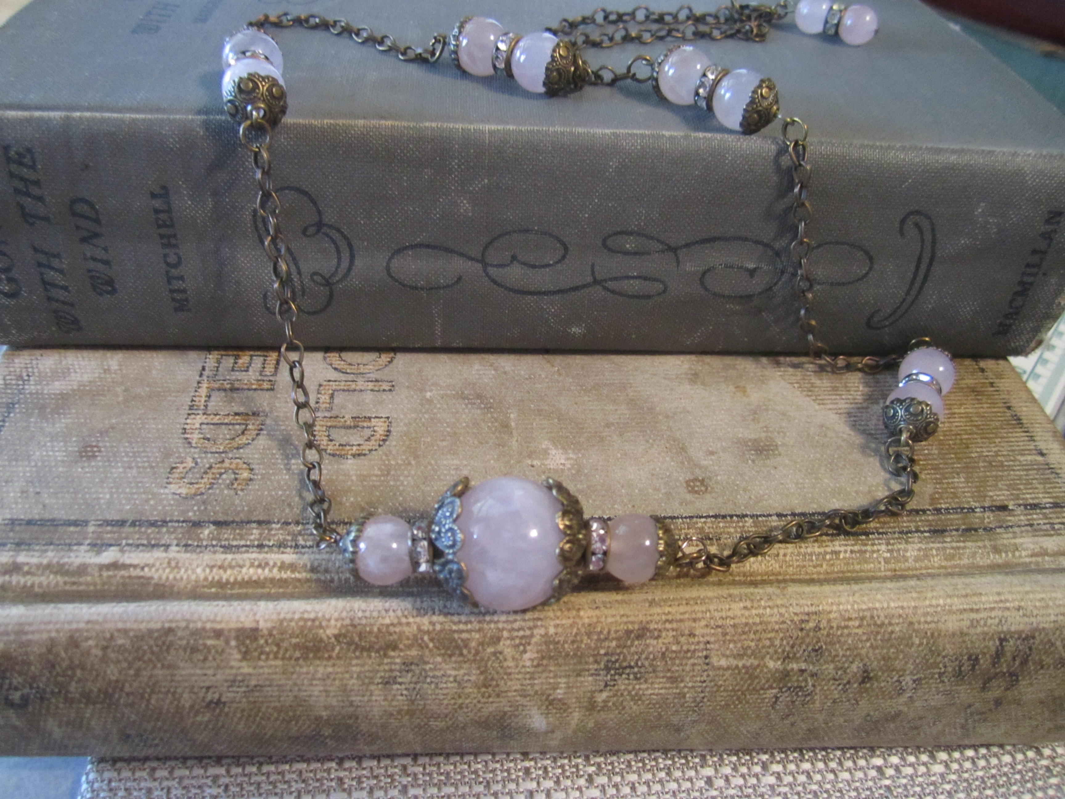 I have had these beautiful rose quartz beads for years. Many years. They are a very soft pink, very light color and very pretty. I have wanted to do something with them for a very long time and finally saw a very old piece of jewelry from the 30’s or 40’s that inspired me to create this piece. I added earrings which I will show in another picture.