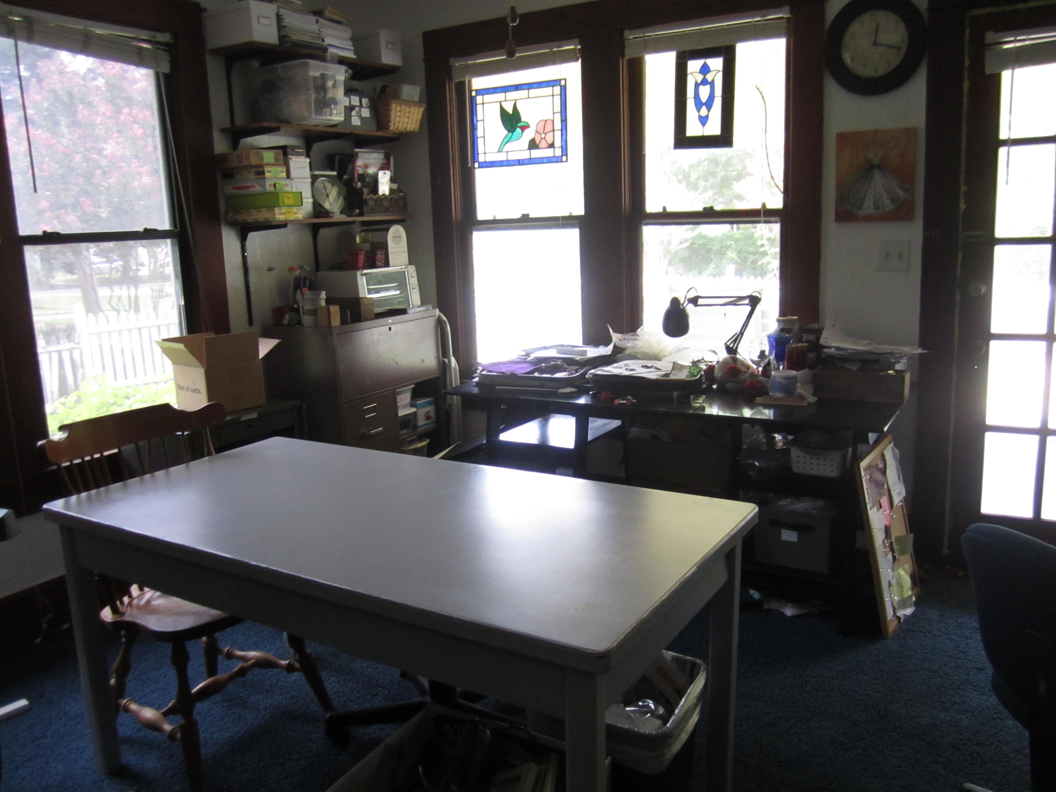 here it is currently , these were taken a few months ago. It has changed a bit., but it is very close to this . I am using a black desk that was under the window for my desk, and the table that floated in the middle of the room is now under that window and we have a fold up six foot table for the middle of the room so we can remove it when needed. Our son took the smaller oak desk when he moved out. So, that is the only major change. It is a mess right now as well as I get ready to move.