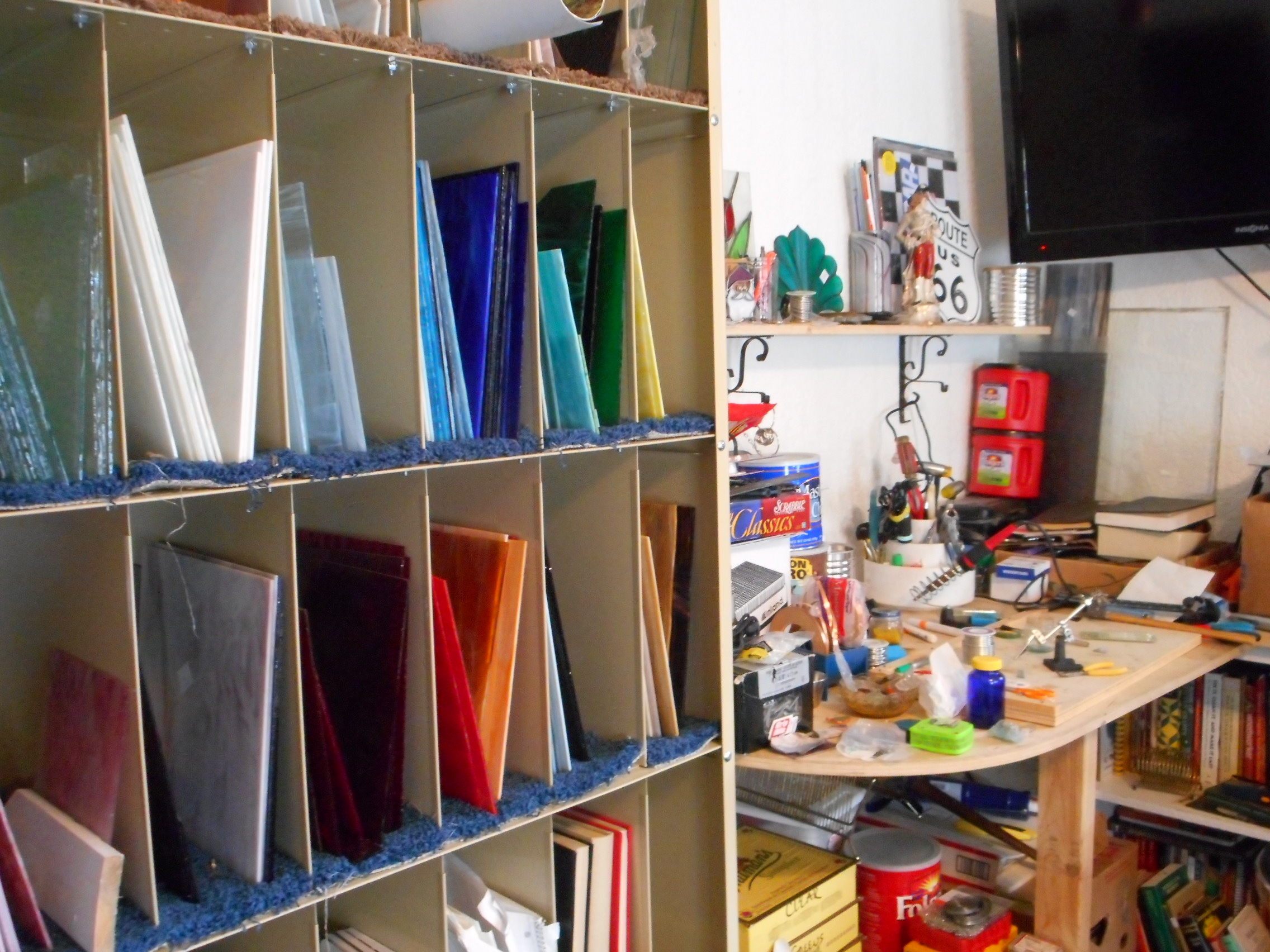 We are in the process of rearranging our house for our daughter and her family to move in while our son in law recovers from being hit by an suv while running. So, we are moving our studio to a different room to allow them to have the front bedroom which is bigger and brighter and attached to the front porch along with the front living room they will be using as thiers, we will use the small family room in back for our space. They also have the bedroom accross from the current studio for our three grand daughters so moving us back a room gives them the front of the house and gives us all a bit more privacy even though we are only moving to the room next door in the middle of the house. It has more wall space then this room as it has less windows.