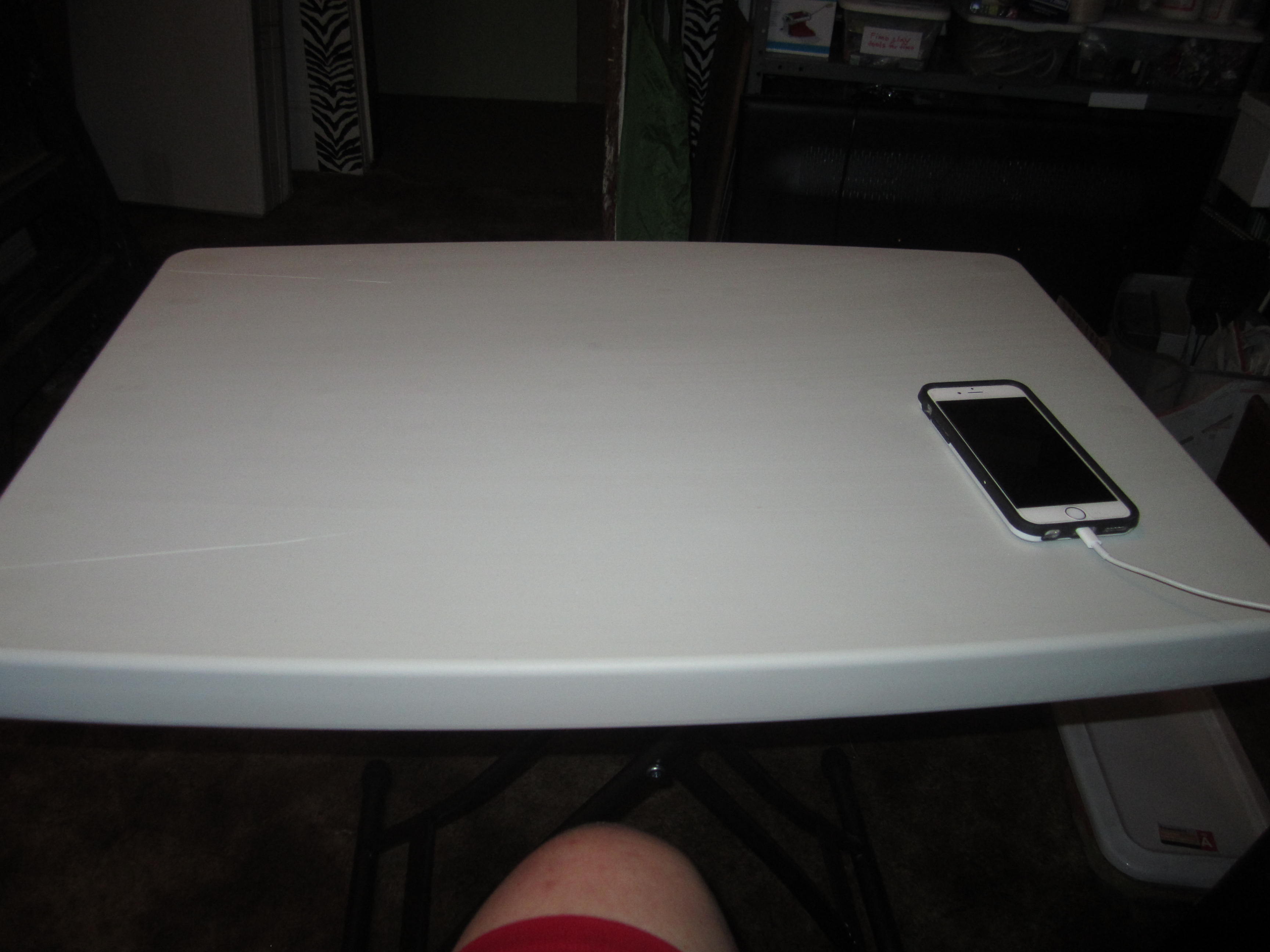 So, our studio has been a mess and will continue to be a mess for a while, but that does not mean I cannot create. We picked up some nice tables at Aldi’s that I fell in love with and know I can use to work on while my bench stores our stain glass pieces until we get the shelf moved this weekend and then I still like the idea I can take the table around the house to whatever room I am in to work. I get nothing from promoting it, but it is such a great table we picked up four for 13 bucks each to have for all kinds of uses and I wanted to share with my readers in case they could use something like this table !! You can see my knee and my iphone 6 as references for the size. It has three different heights you can set it at.