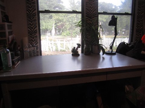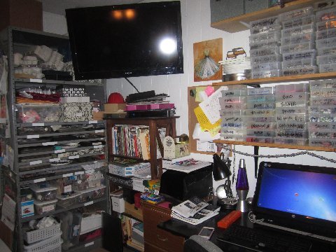 We put the light table for the stain glass in the corner,with a piece of plywood over it for protection, and then put the desk and work table up to each side, which really worked out well. It filled in that corner nicely !! If we need to use the light table down the line, I will just remove the stuff stored on top, but it will be a while until we are using it, the stain glass side is a big mess for now. With overtime and a major kitchen redo in the works, stained glass is not top priority for now !!