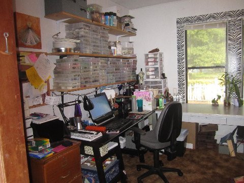 Things change and in December our son in law was hit by a car while jogging and spent five months recovering, much of it in critical care. We all talked it over and since it will be a while until he can work, he has a job, they are holding his job for him, but he is not able to work yet, so we all decided the best course of action was for them to rent out their home and move in here. So, that is what we just did. We decided to let them have the front bedroom as it is a lot bigger for them to get around around and store what they need , so , we moved our studio from that big front room, into the smaller middle bedroom. Which actually gave us a lot more wall space with less windows and doors.
