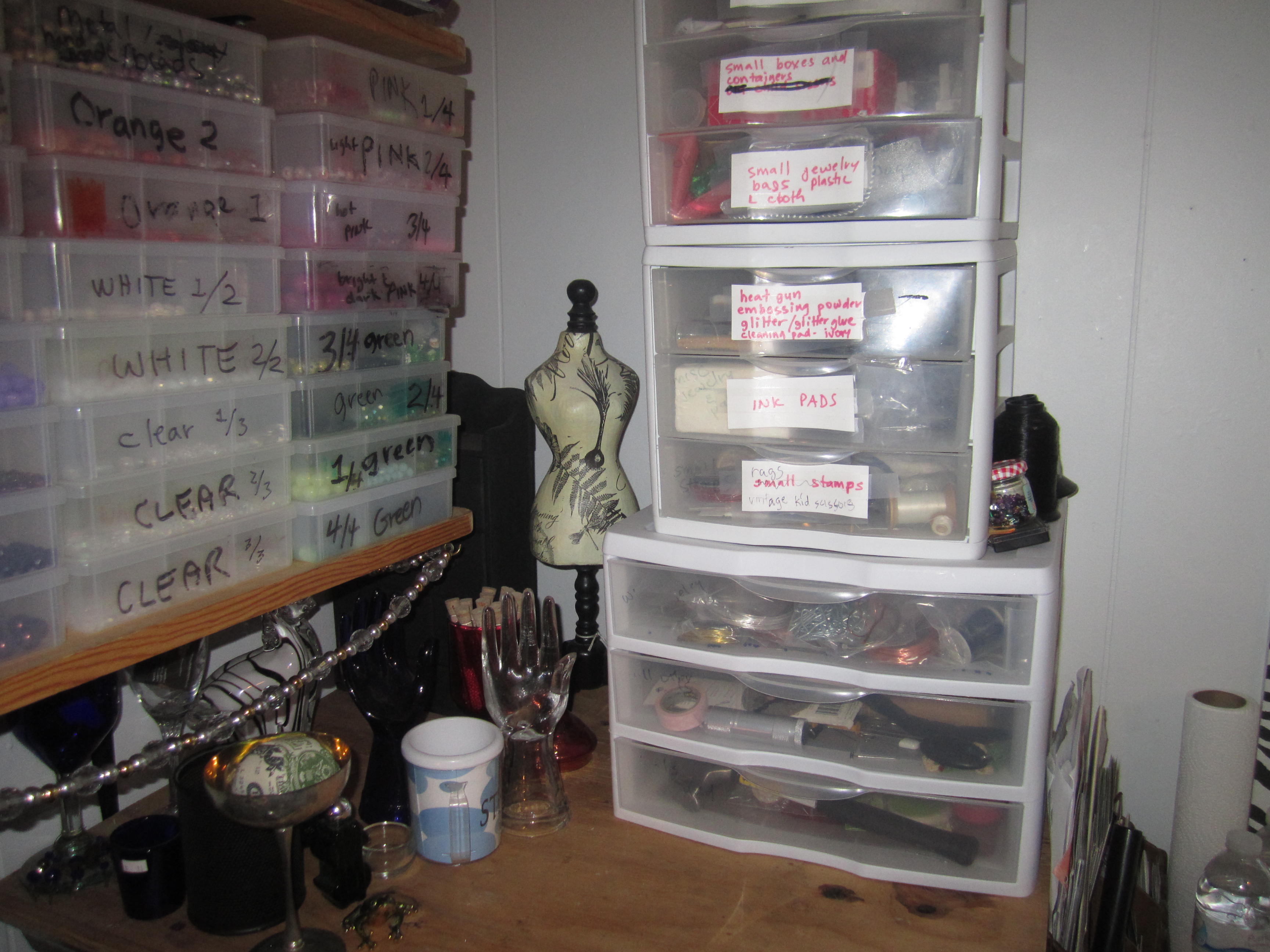 The light table has a lot of my fun treasures on it as well as stacks of drawers for wire, tools that do not fit in the work table drawer, stamp pads, and just all kinds of things !! Easy to move when needed but keeping them up on the table gives me more work space. At first I had them in the corner of the table next to the light table, but I am much happier having the entire work table free , except where the plants are !!