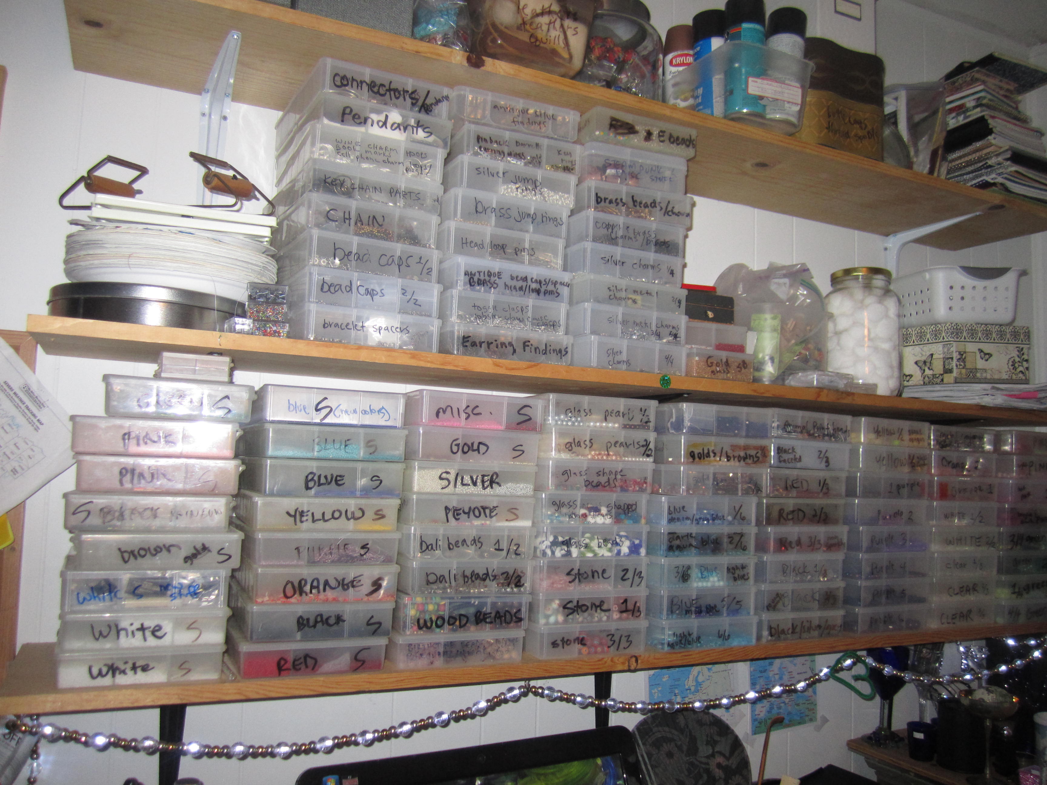 The big shelves with all my non beading stuff, my sequins , my fabric, my felt, paints and all kinds of other wonderful things are on this big metal shelf.