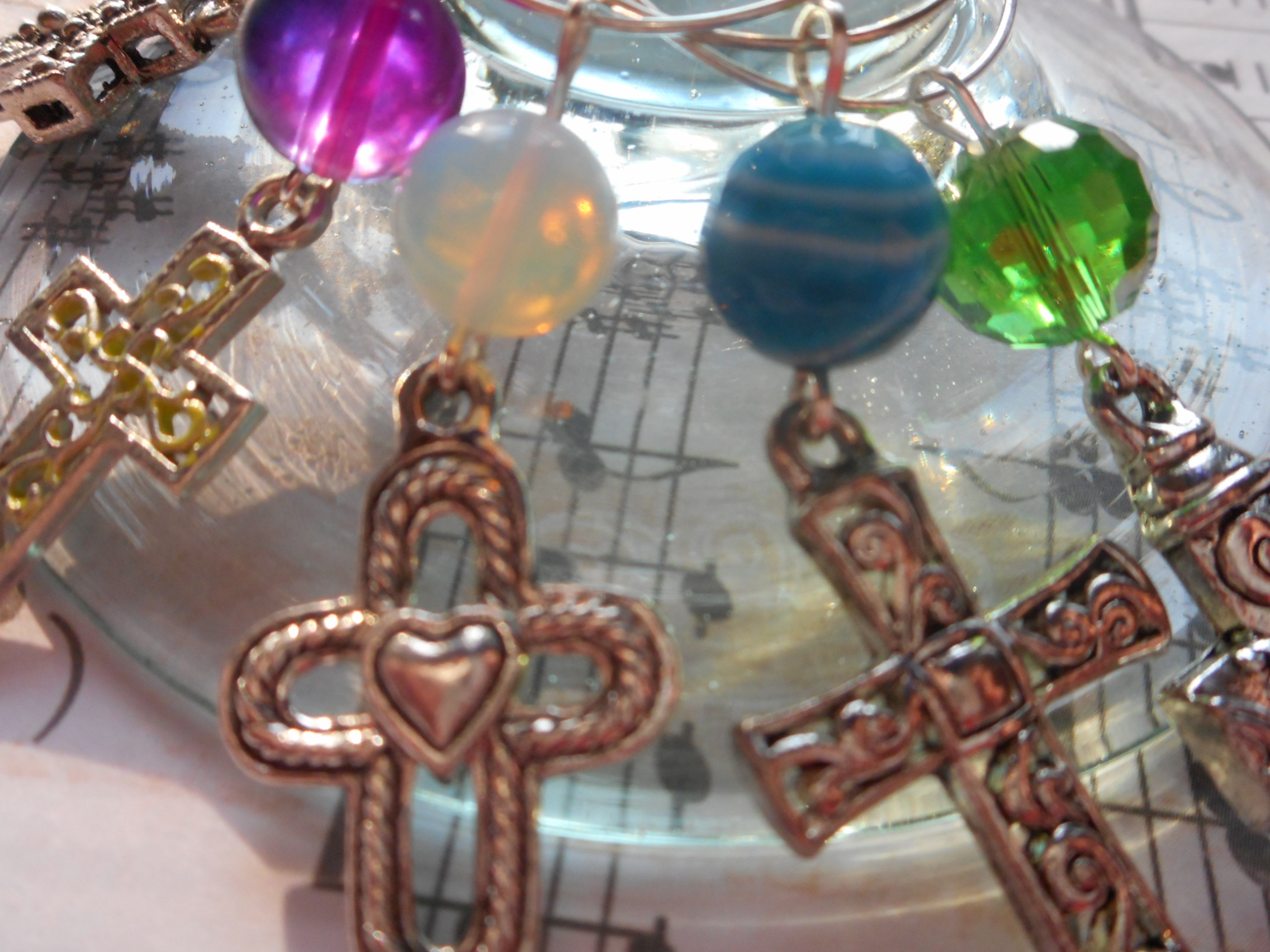 Cross wine charms, many of the crosses are recycled from old pieces. I used some gorgeous beads in this set. A glass pearl that has an irredescence with purples, grays, pinks, greens, a teal and pink bead that is stunning and a gorgeous opal like glass bead. The clear and green are gorgeous and there is a stone swirled blue bead as well.
