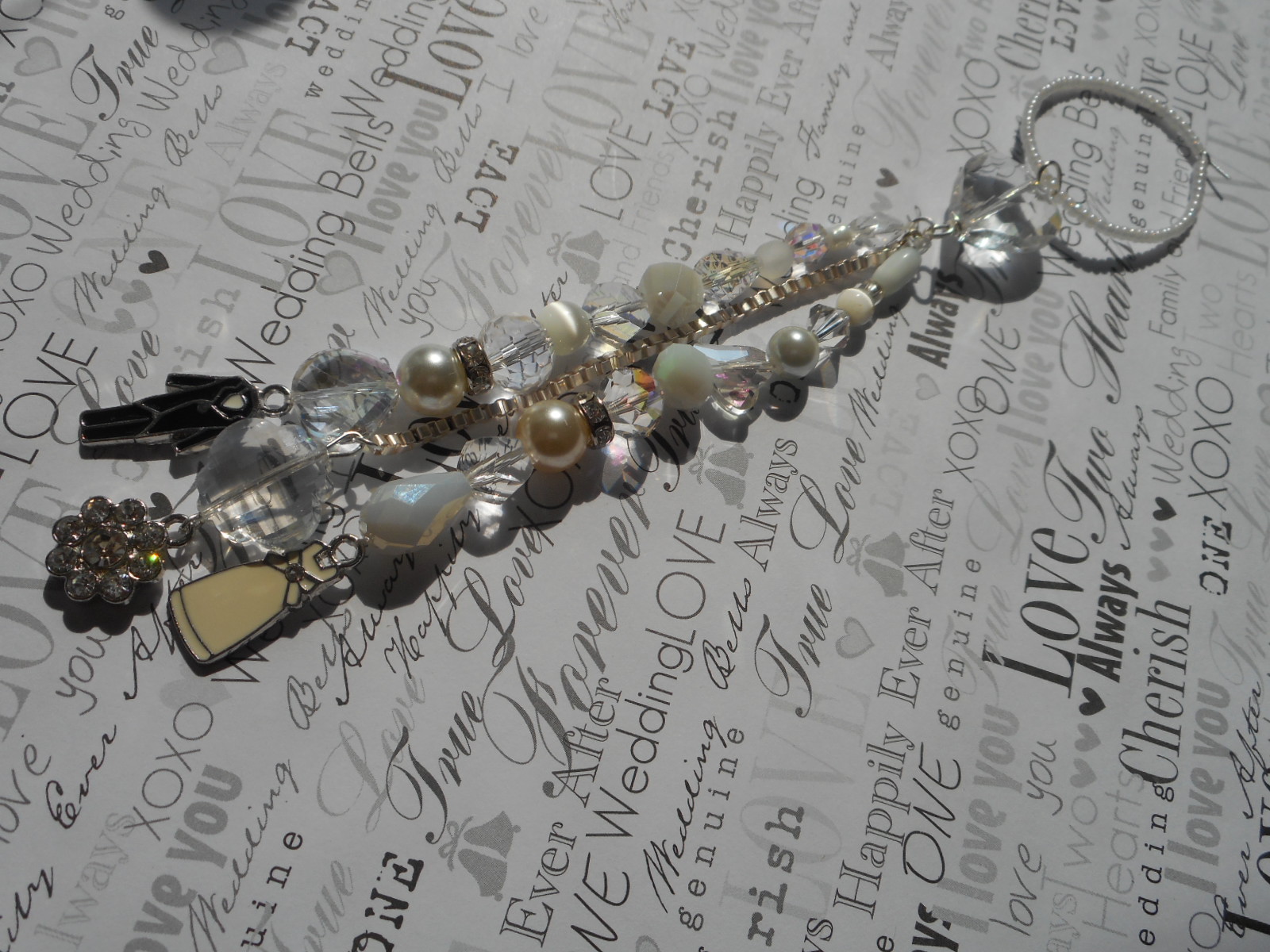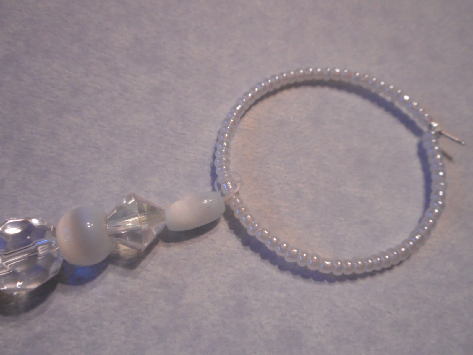 Same ring as the other white one, the premade extra large hoops I had bought last year for a custom order I was doing. Same glass pearl seed beads. I used a heart bead at top and some cute charms I also used on a charm bracelet, seen in this listing , you can see the same little bride and groom and some other pretty charms in the bracelet. My only two sets of these charms, so I will not be able to make anymore with them, I bought them several years ago !!