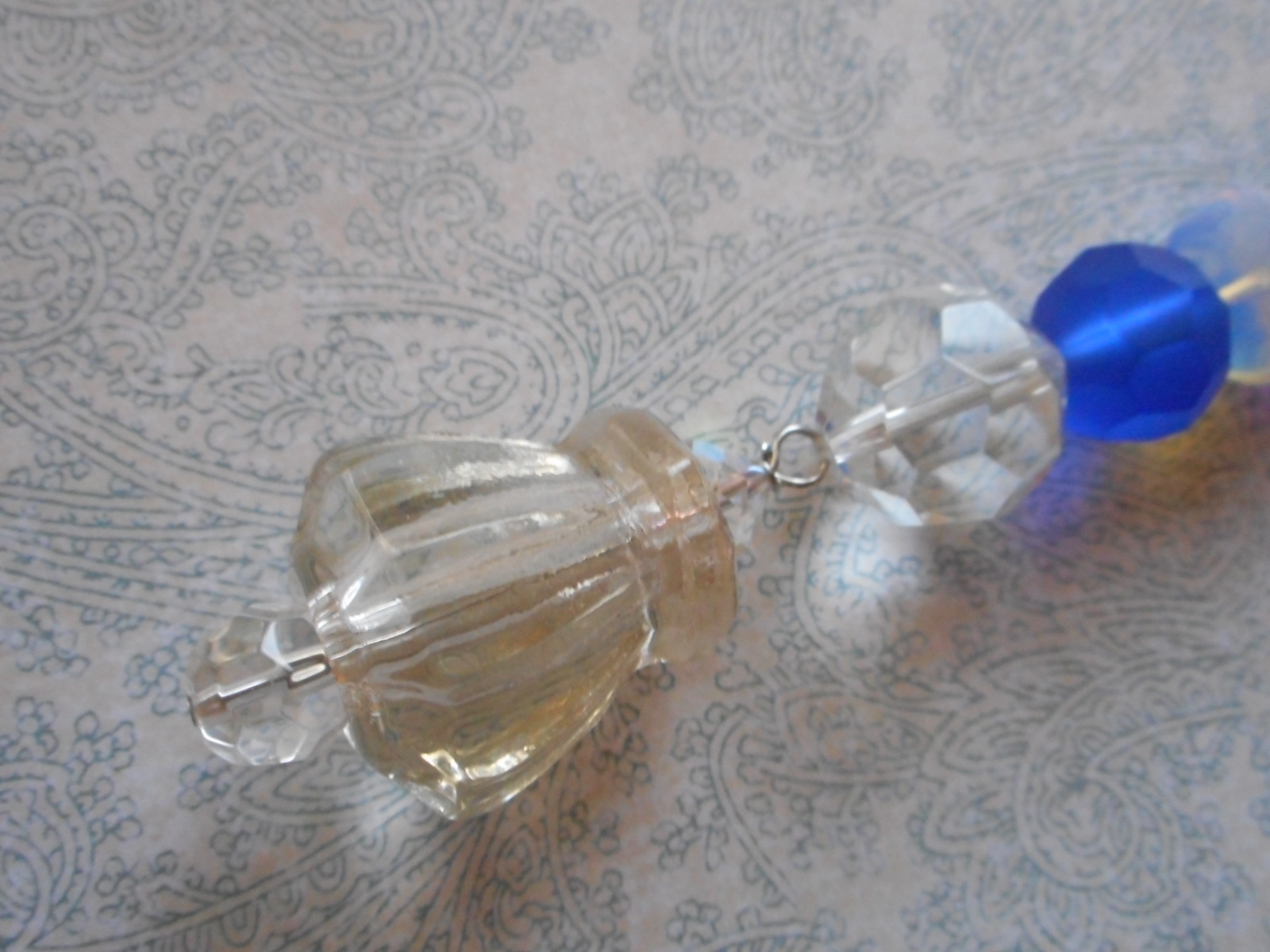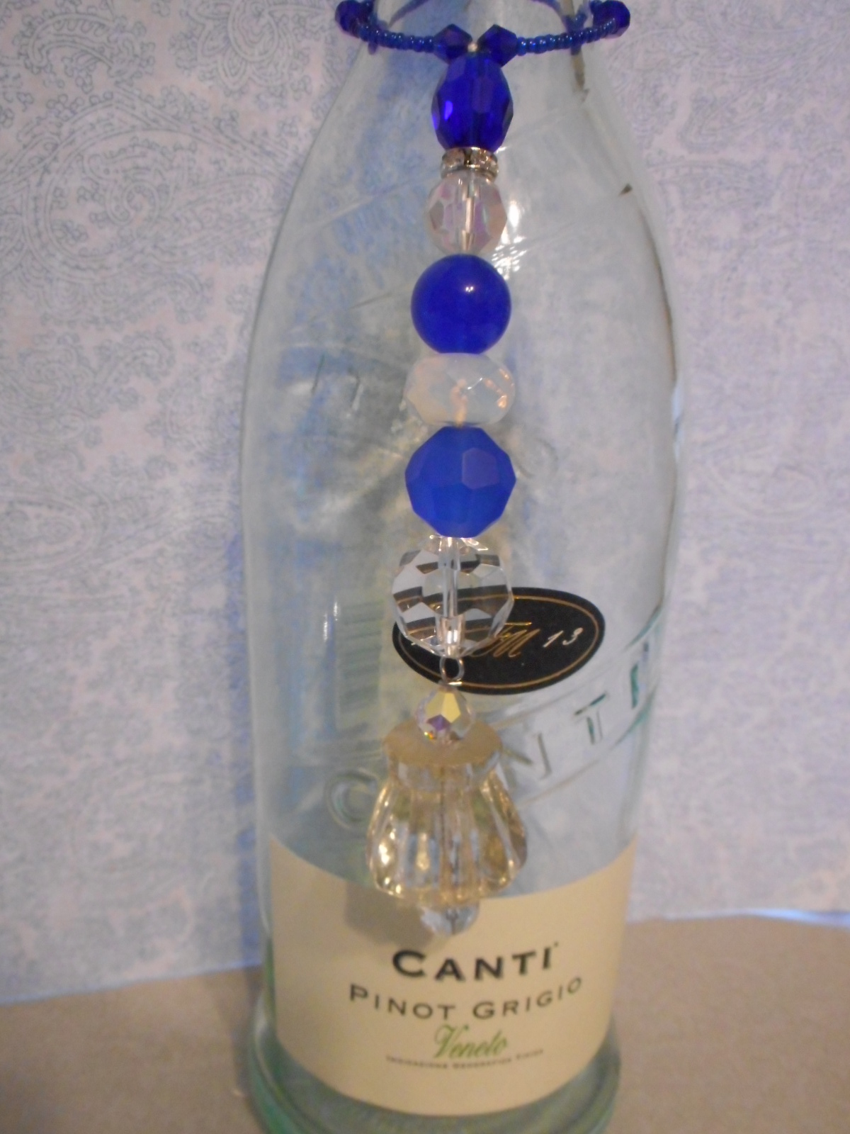 Anyone who knows me even a bit, knows I adore cobalt blue . It should not come as a shock that one of my first pieces has cobalt blue in it !! I used a vintage glass knob at the bottom and used gorgeous glass beads, pretty good sized ones in this piece. I made a bigger loop than my already large big loop I bought for this type of item, but this one was just too heavy. I used very heavy beading string and then doubled it up to string the beads so it lies nice on a bottle or any surface that might be uneven, wire would have stuck straight out. All glass, and glass seed beads and bicone beads on the hoop I made.