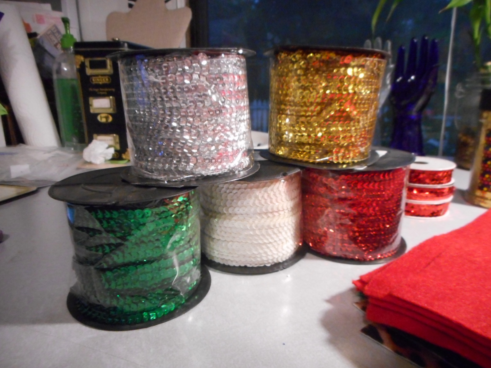 Look at these wonderful rolls of sequin ribbon. It is exactly what it sounds like. Sequins sewn together to make a ribbon. I had found some at Hobby Lobby, those three tiny rolls at the back, 4 yards each, but flat seqins, at 1.50 a roll . They were not what I wanted. I want to recreate a craft from over 30 years ago and they were made with cupped sequins, which they did not have. I looked on line and found them !! I bought five spools, 80 yards each for only 5.99 a roll. Shipping was around 8 bucks, I bought five colors. All of them are 6 mm cupped sequins sewed together to form a slim ribbon. I am thrilled. I found them on a site called Paper Mart, never had heard of them before, but was thrilled with the quality and availability of what I was looking for !! Price was much cheaper with a wider variety of these ribbons, had found limited colors on another site, smaller roll, only 70 yards for 4 bucks more a roll and they did not have all the colors I wanted in the cupped sequin. I know they have a lot of other products, so worth checking out. I always let you know when I find a great place to buy things, so I thought I would pass their site along today.